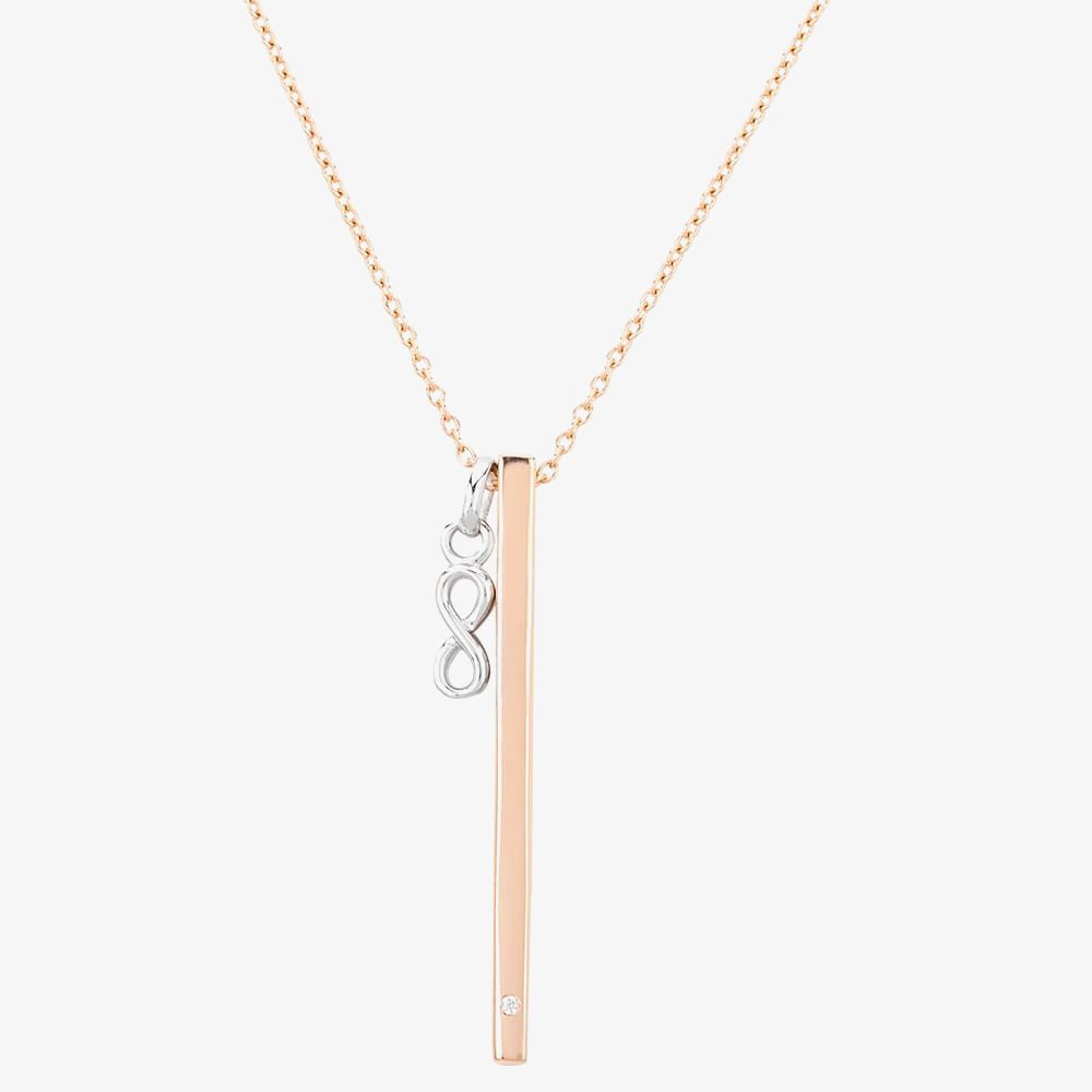 Isabella Verona present this shimmering silver bar pendant, adorned with a small charm and subtle cubic zirconia detailing for a more personal touch. The polished figure-of-eight is finished in rhodium for protection against tarnishing, as well as a pop of colour against the rose gold-plating of the bar and chain.