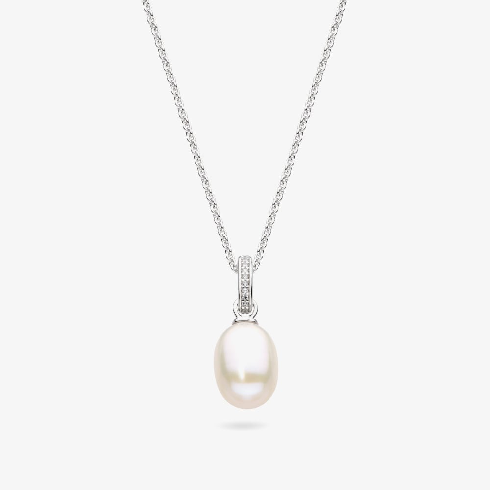 Elegant and timeless, the Kit Heath Silver Revival Classic Pearl Glitz Necklace features a lustrous freshwater pearl pendant, with the bale set with sparkling white cubic zirconia for added brilliance. Suspended from a rhodium plated sterling silver spiga chain, adjustable to be worn at 16 or 18 inches, and finished with a lobster clasp, this refined necklace is perfect for adding classic sophistication to any look.