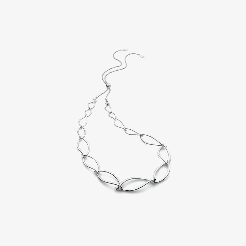 Beautifully crafted in sterling silver, this striking design features a fluid twine twist motif, representing strength, connection, and harmony. Designed to sit perfectly at the neckline, this necklace effortlessly transitions from day to evening wear, making it an essential piece for any jewellery collection.