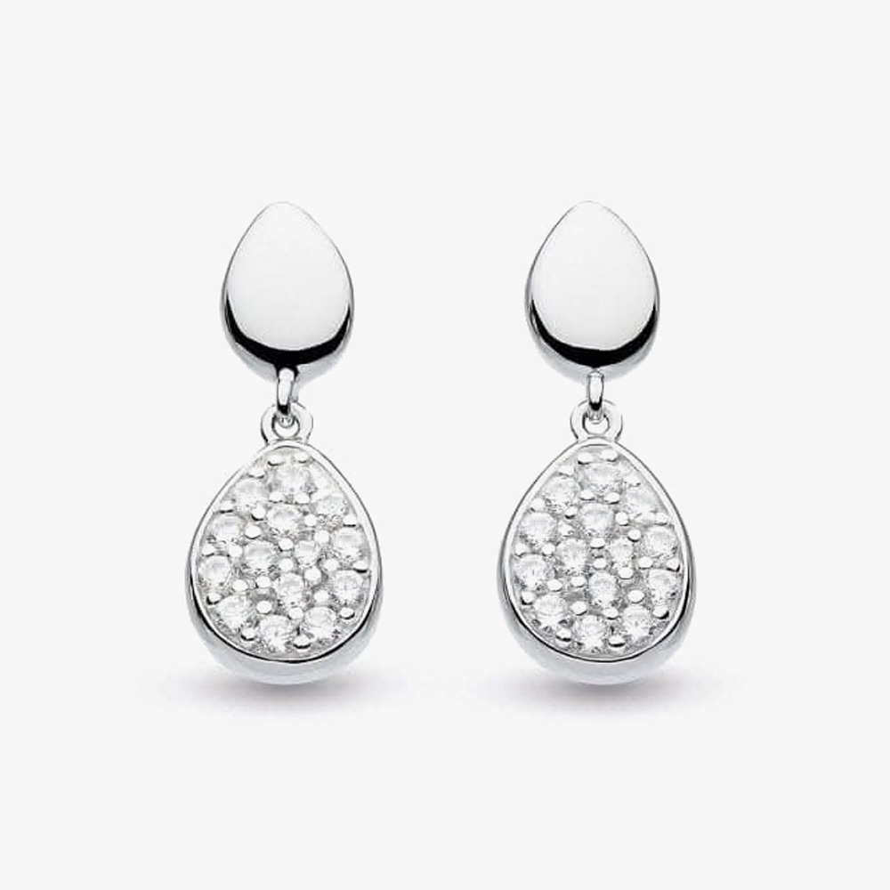 Each earring features a graceful drop design, showcasing two distinct, organically shaped pebbles that gently cascade. These smooth, tactile silver forms evoke the comforting feel of genuine, ocean-tumbled stones, brought to life in lustrous sterling silver with dazzling cubic zirconia stones. The slightly varied sizes of the two droplets create a dynamic and charming visual appeal, reminiscent of water droplets or pebbles softly resting on one another.