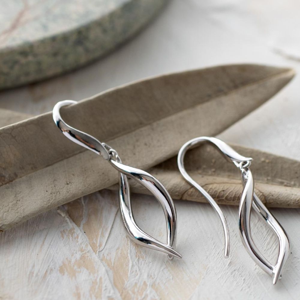 Each earring features an intricate Twine Twist design, where highly polished sterling silver links gracefully intertwine, creating a fluid and dynamic drop silhouette. This distinctive, yet understated design adds a touch of modern femininity and natural allure to your everyday style.