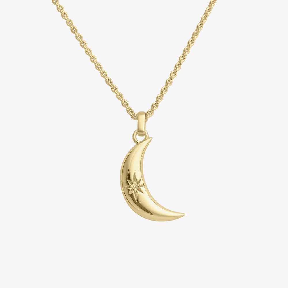 Exude subtle elegance with the Little Star Alya Pendant Necklace, crafted in 9ct yellow gold. The crescent moon-shaped pendant is delicately set with a single 0.05ct diamond, suspended from an adjustable trace chain. Perfect as a cherished keepsake or a piece of everyday luxury, it brings a refined sparkle to any look.