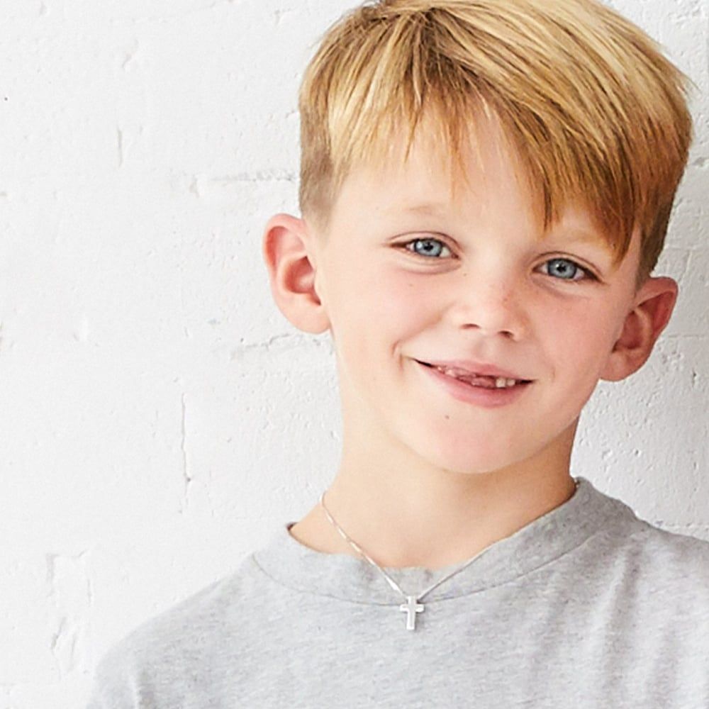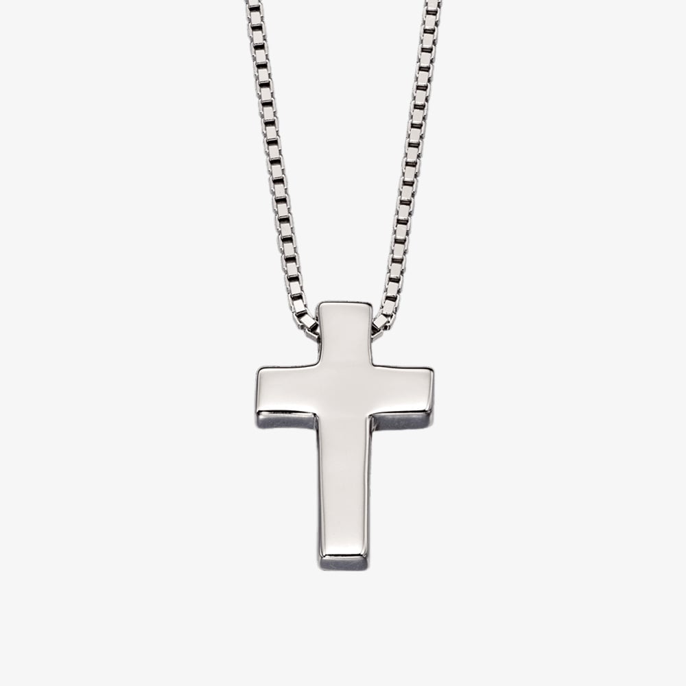This necklace showcases a durable sterling silver chain that securely holds a cleanly designed cross pendant. Its straightforward and classic style makes it a versatile piece suitable for everyday wear or for special occasions. It serves as a constant and subtle reminder of faith.