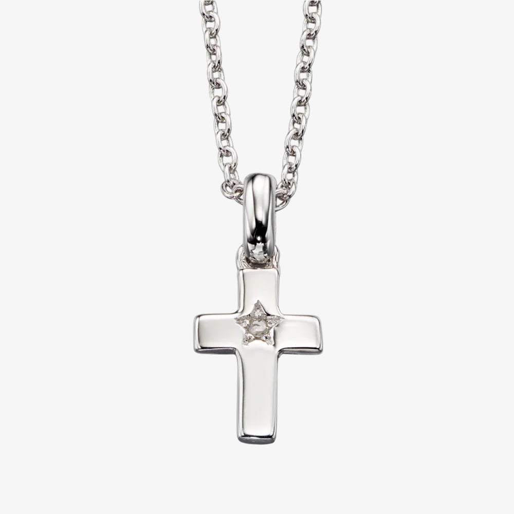 This necklace showcases a fine sterling silver chain that elegantly suspends a beautifully formed cross pendant. At the centre of the cross, a tiny, sparkling diamond is carefully set, adding a touch of subtle brilliance and significance to this cherished symbol of faith.