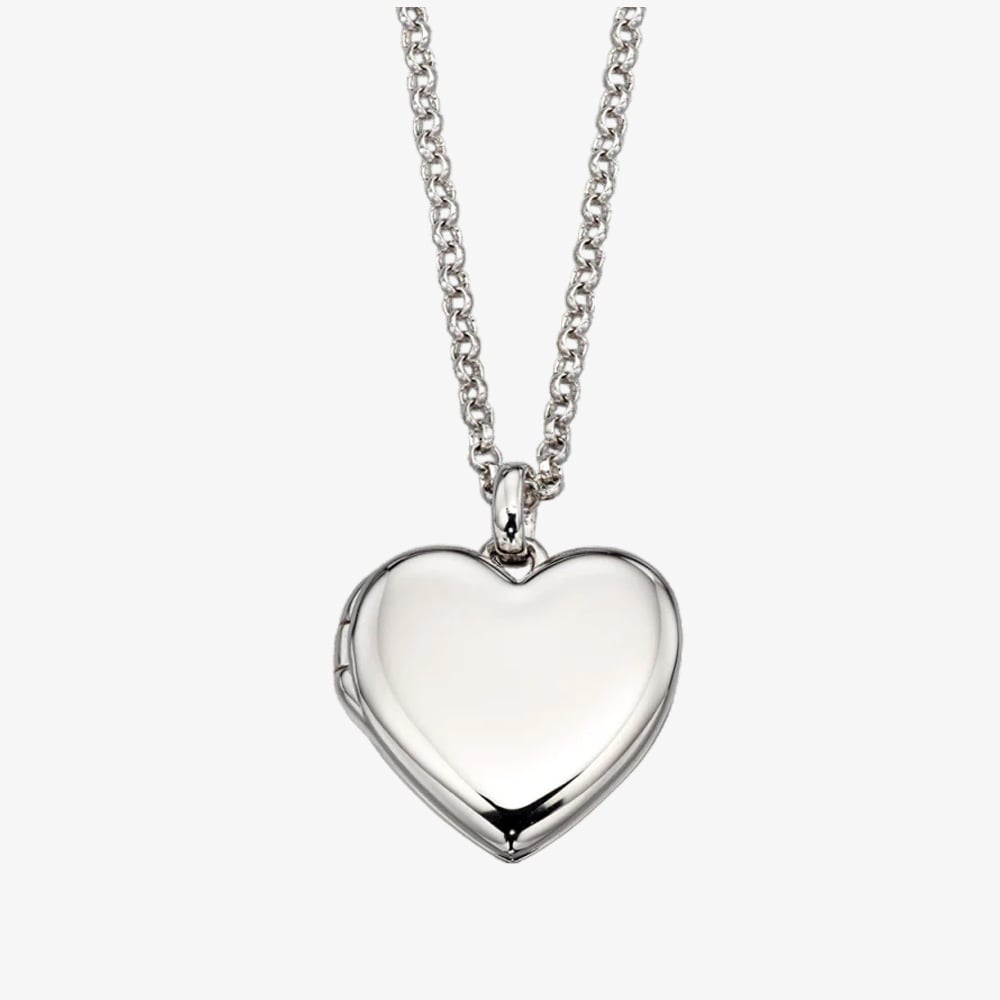 This necklace showcases a delicate sterling silver chain that gracefully suspends a sweetly formed heart locket. This timeless design opens to reveal space for two small photographs, a tiny note, or other special mementos.