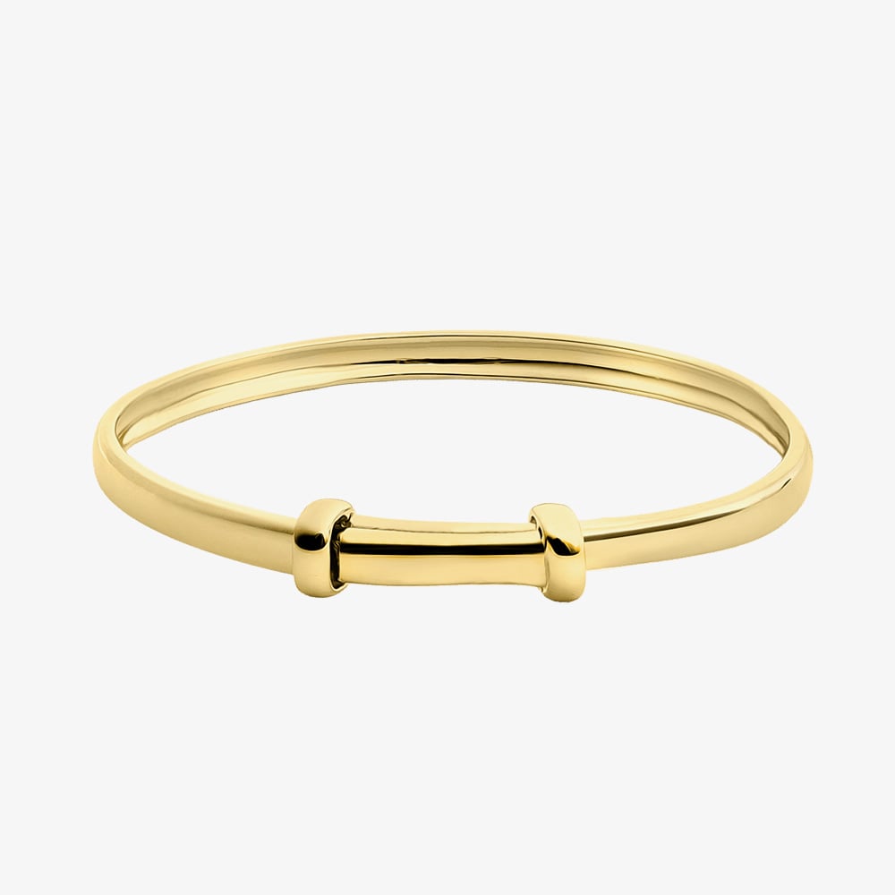 Crafted in heavyweight 9ct yellow gold, this adjustable baby bangle features a sleek, plain design, suitable to wear comfortably up to around age five. A perfect new baby gift, christening present, or treasured keepsake, it combines timeless elegance with enduring quality for little ones to cherish.