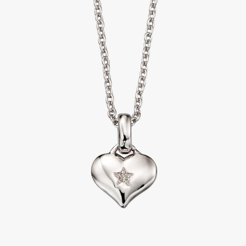 This necklace showcases a fine sterling silver chain that gracefully holds a beautifully formed heart pendant. Nestled within the heart is a tiny, yet dazzling, genuine diamond. This precious sparkle adds a touch of elegance and makes the necklace a truly special piece.