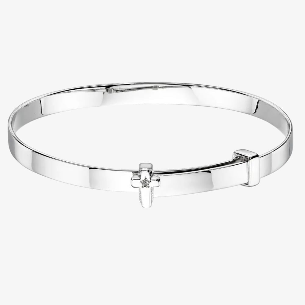 This expandable silver bangle ensures a comfortable and lasting fit. The polished sterling silver finish radiates sophistication, while the subtle diamond cross adds a touch of brilliance. This bangle is a precious piece to treasure for years to come.