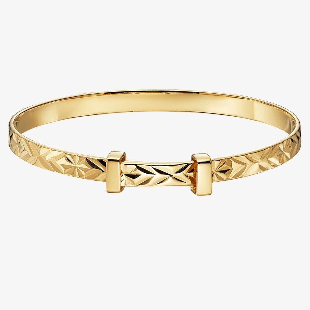 This bangle features a delicate gold plating that adds a touch of warmth and luxury. Its enchanting diamond-cut pattern catches the light beautifully, creating a subtle yet captivating sparkle that will delight both baby and parents. This intricate detailing adds a touch of elegance, making it perfect for everyday wear or special occasions.