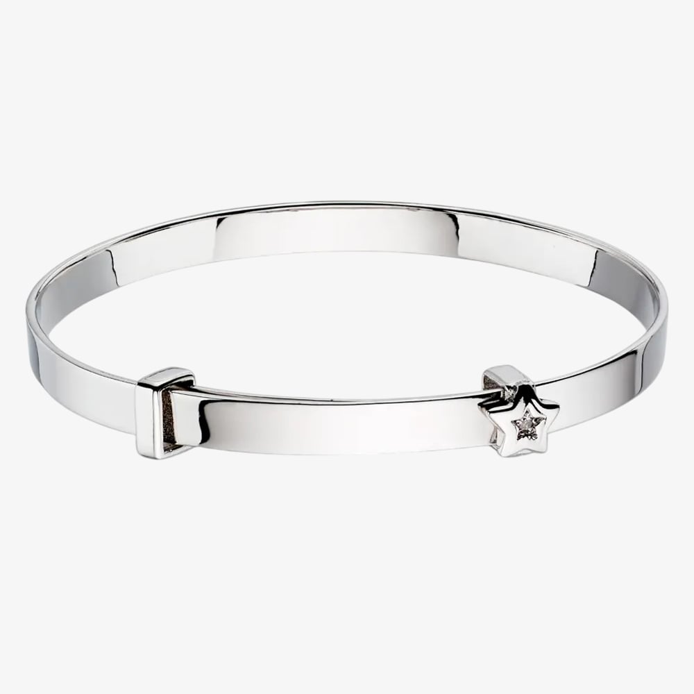 A delicate and timeless piece crafted from premium sterling silver and adorned with a shimmering diamond star, this bangle is a symbol of love, protection, and cherished memories. Designed with an expandable fit, this baby bangle ensures comfort and longevity. The smooth, polished sterling silver finish provides a classic yet modern touch, while the delicate diamond star adds a subtle sparkle, making it perfect as a treasured keepsake.