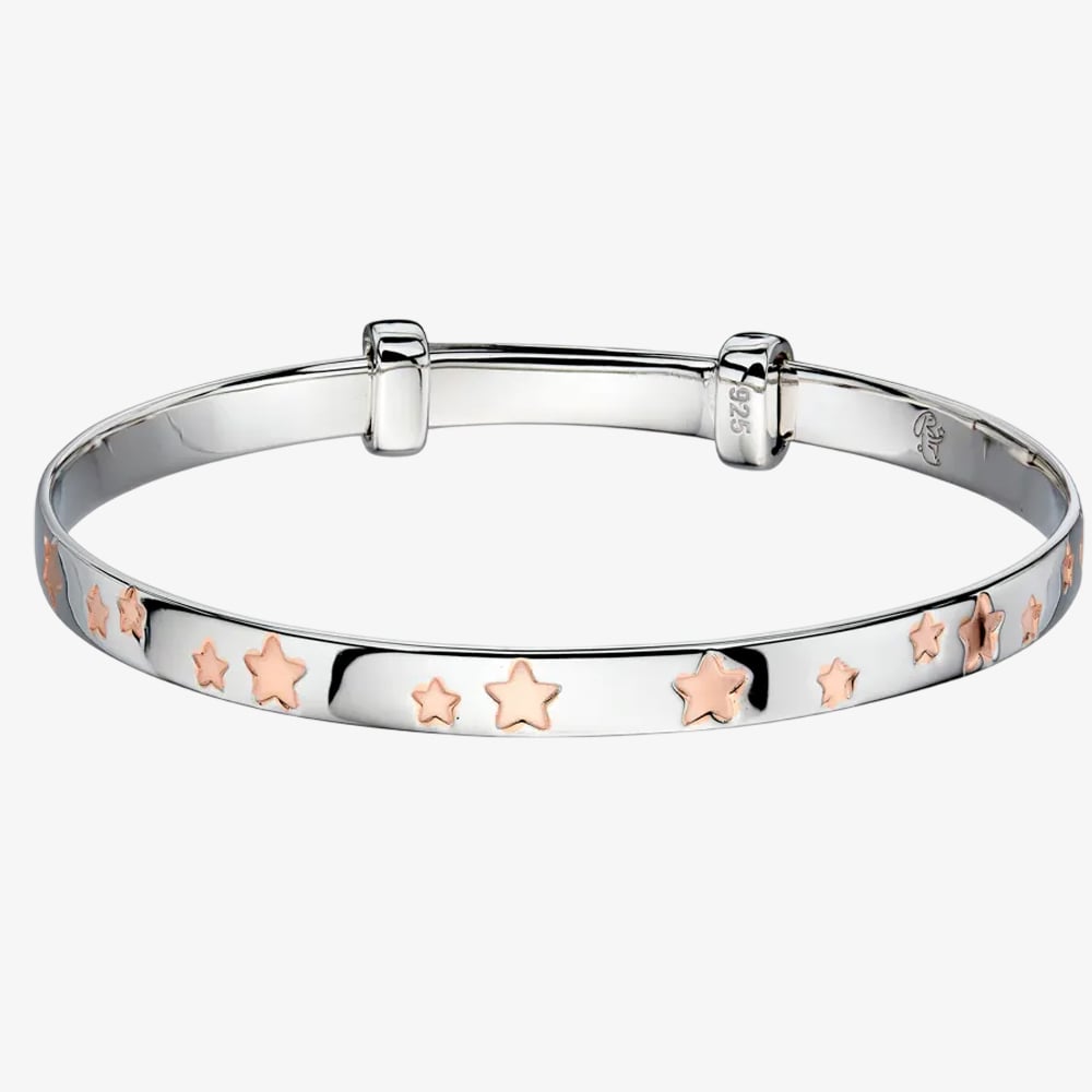 Featuring an expandable design, this bangle adjusts to fit your baby comfortably as they grow. The high-polish sterling silver finish adds a touch of elegance, while the warm rose gold-plated stars create a beautiful contrast, making it perfect for special occasions or everyday wear.