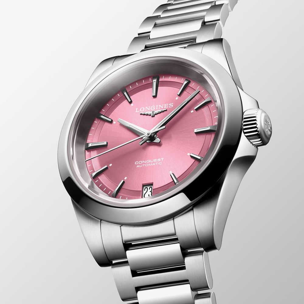 This new Conquest model is powered by an exclusive Longines self-winding mechanical movement. It comes in a 34 mm stainless steel case, water-resistant up to 10 bar (100 m). The watch features a pink sunray dial with a snailed finish, rhodium-plated hands, and applied rhodium-plated hour markers enhanced with Super-LumiNova. The date window is positioned at 6 o'clock. It is paired with a stainless steel bracelet. The self-winding mechanical movement operates at 25,200 vibrations per hour and includes a monocrystalline silicon balance-spring, providing a power reserve of up to 72 hours.
