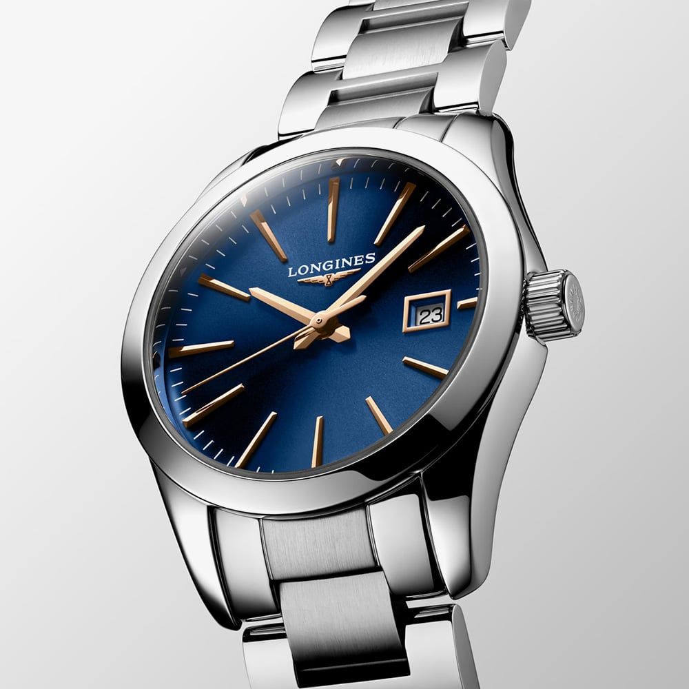A 29.5mm stainless steel case and bracelet teamed with a triple folding safety clasp and push button. Scratch resistant sapphire crystal with several layers of anti-reflective coating applied to the underside protects the dial, which consists of a blue background with rose gold hands. Functions also include a date display and an end of life indicator, and power is generated by the L152 quartz movement.