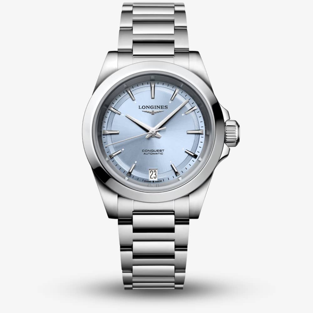 The new Conquest timepiece is a must-have for any watch collection. It features a screw-down crown, an exclusive Longines self-winding movement and a stunning pastel-blue sunray dial. The rhodium-plated hands and applied hour markers are treated with Super-LumiNova to further enhance its elegance and visibility.
