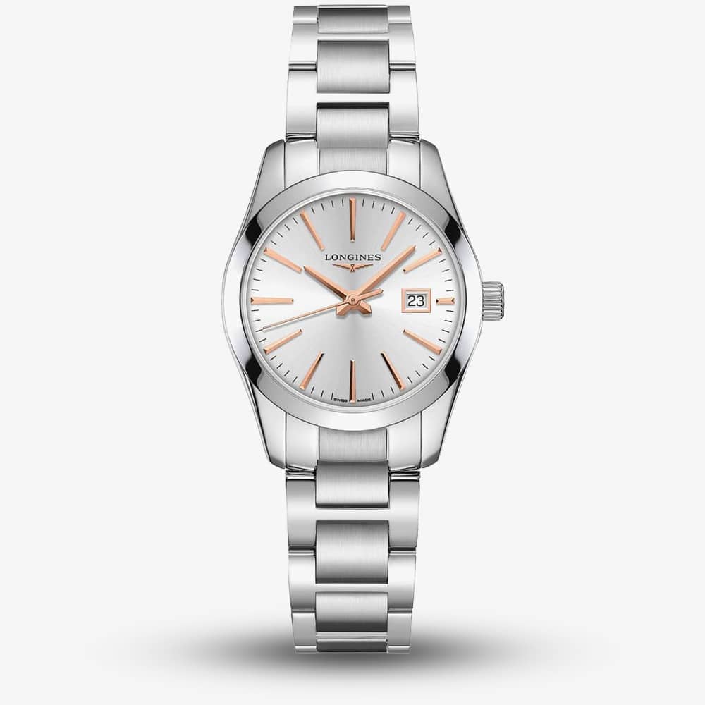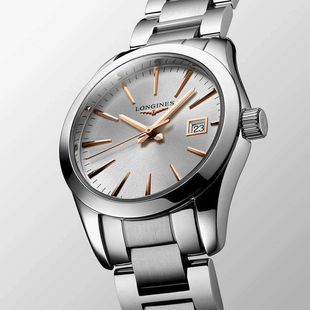 A 29.5mm stainless steel case and bracelet teamed with a triple folding safety clasp and push button. Scratch resistant sapphire crystal with several layers of anti-reflective coating applied to the underside protects the dial, which consists of silver with rose gold hands and indexes. Functions also include a date display and an end of life indicator, and power is generated by the L152 quartz movement.