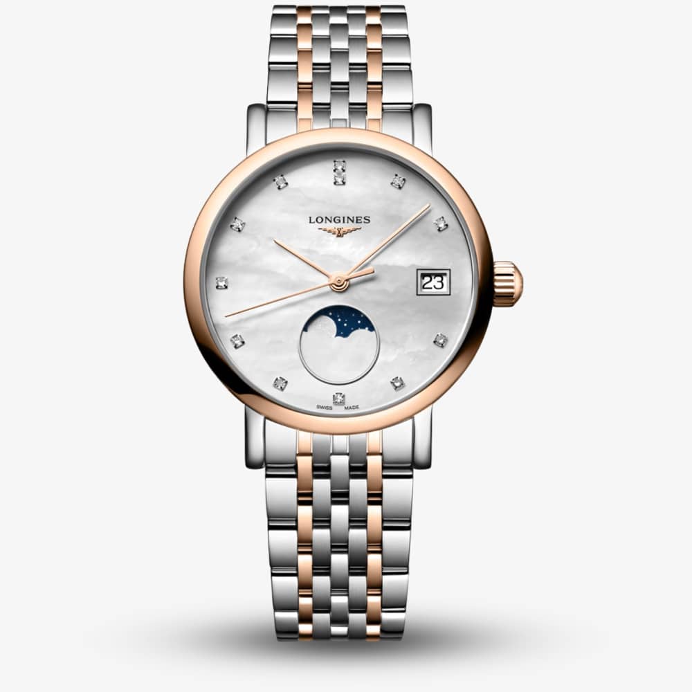 Since its inception, Longines has consistently prioritised elegance. This quality is evident not only in its products but also in its communication, epitomised by the famous slogan "Elegance is an attitude." This ladies two colour watch features stainless steel with 18ct rose gold, a mother-of-pearl dial, and diamond dot hour markers, complete with a monophase complication.