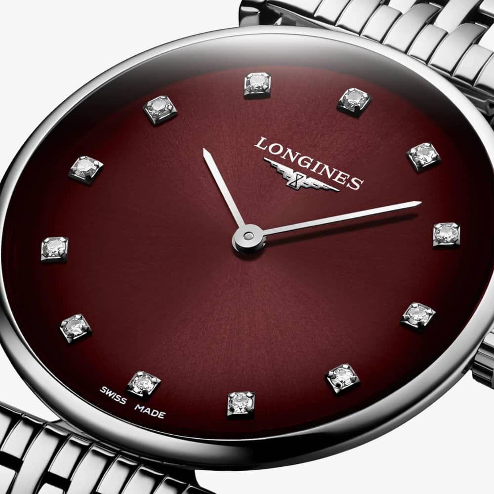 The Longines L4.512.4.91.6 La Grande Classique watch combines a 29mm round-shaped stainless steel case and silver stainless steel bracelet with a push button deployment clasp. It has a Bordeaux red sunray analogue dial with silver hands and 12 Top Wesselton VS-SI diamonds set at each index, with a total weight of 0.081 carats, protected beneath scratch-resistant sapphire crystal glass. Power is generated by the Swiss quartz movement. This model also has a water resistance of up to 30 metres.