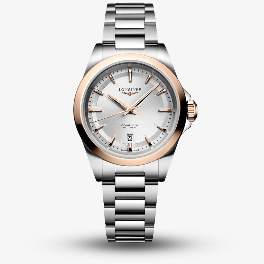 This stunning watch features a 30mm stainless steel case, beautifully accented with a rose gold bezel that adds a touch of warmth and luxury. The silver dial is understated yet striking, adorned with applied rose gold-tone hour markers and sleek hands for a refined look. A date window at 6 o'clock adds practicality without compromising the aesthetic balance. The watch is powered by a reliable Swiss automatic movement, offering precision timekeeping and a transparent case back to admire the intricate mechanics. The stainless steel bracelet provides both comfort and style; water-resistant up to 100 metres, this watch seamlessly blends everyday functionality with timeless charm.