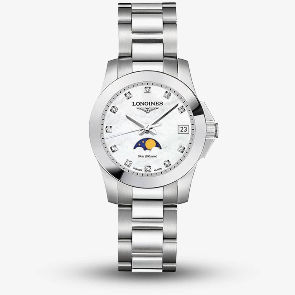 A fashionable ladies watch from the Longines Conquest collection which features a mother of pearl dial complete with diamond set hour markers and silver tone hands. Functions include a date window at 3 o clock and a beautiful moon phase function at the 6 o clock position. Fastens comfortably using a stainless steel bracelet.