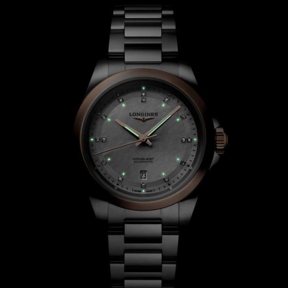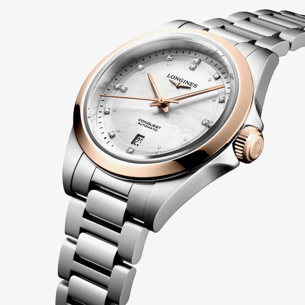 The Longines Conquest watch is crafted for every aspect of life, embodying the brand’s commitment to performance and watchmaking excellence. This elegant model features a stainless-steel case paired with a rose gold bezel, creating a refined contrast. The white mother-of-pearl dial is adorned with sparkling diamond hour markers, adding a touch of sophistication to its sporty spirit. A perfect blend of style and functionality, the Conquest is designed to accompany you effortlessly from day to night.