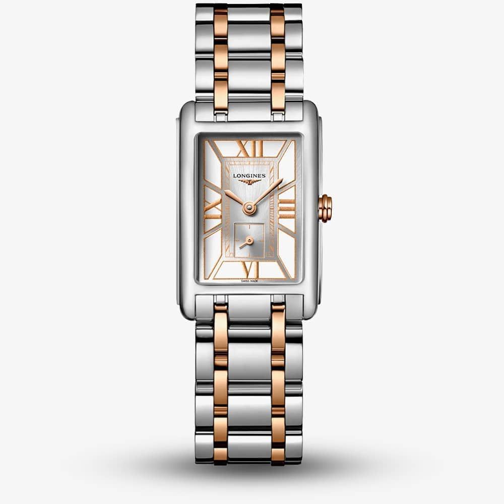 The Longines Ladies Dolcevita elegant timepiece features a crisp white dial adorned with painted Roman numerals and indexes for a timeless look. The bracelet combines stainless steel with 18ct rose gold cap 200 accents, offering a refined two-tone finish. Secured with a triple safety folding clasp and push-piece opening mechanism, it blends classic design with everyday comfort and reliability.