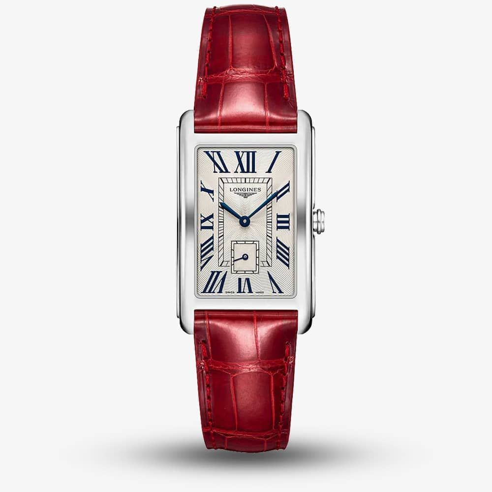 This glorious timepiece consists of a glamorous red alligator strap with a rectangular stainless steel casing. A sapphire crystal glass dome offers an exceptional level of protection for the dial, which consists of a patterned silver background accompanied by bold blue roman numerals. A small sub dial displays the seconds, and the brands subtle signature logo adds a great finishing detail.
