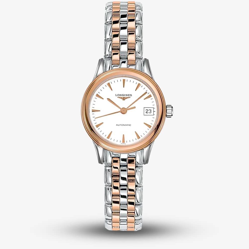 The Longines Flagship radiates elegance and prestigiousness, ideal for giving your evening wears an eye-catching finish. The highly polished stainless steel is adorned with on trend rose gold detailing for a more glamorous look. The round white dial is powered by a Swiss automatic movement and features a date window for extra functionality.