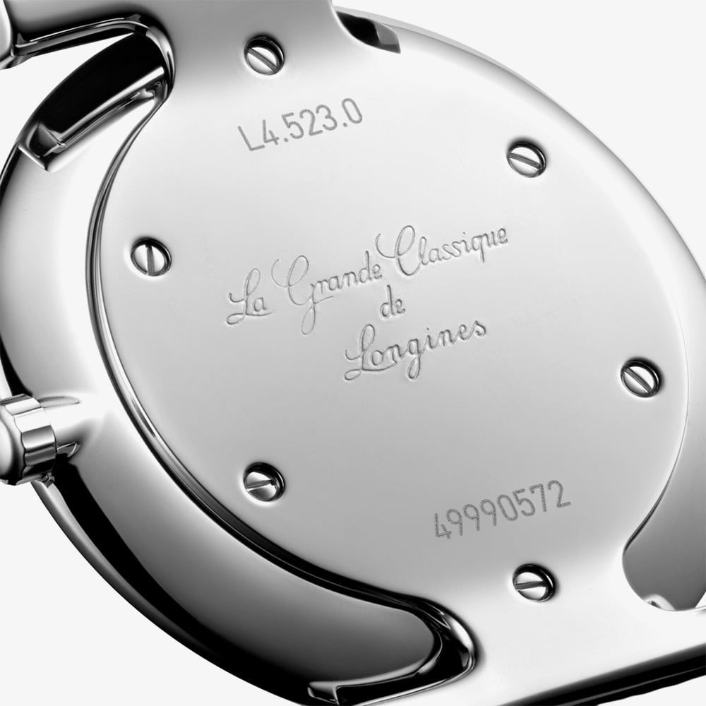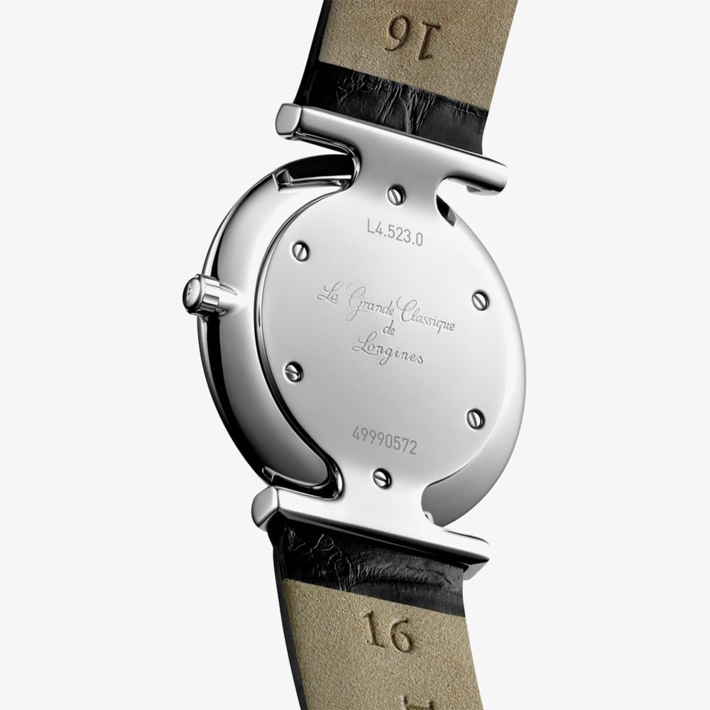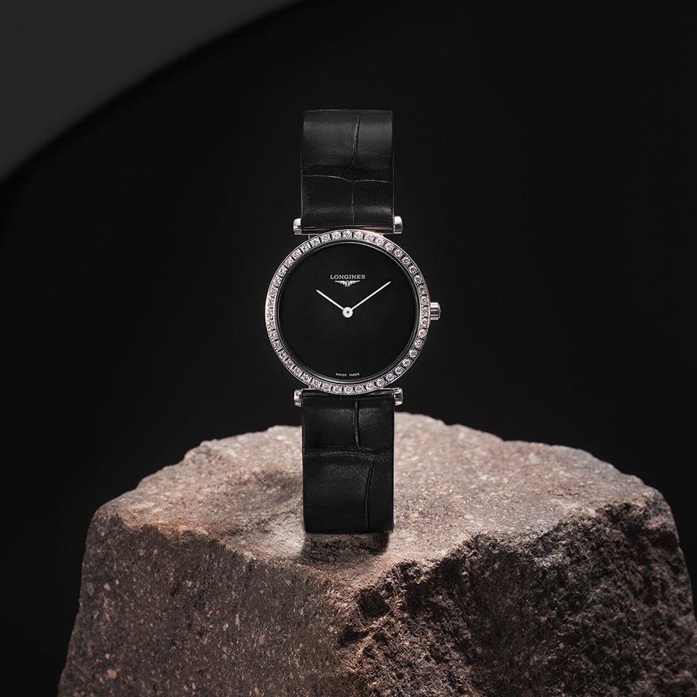 Launched in 1992, La Grande Classique de Longines has helped define the brand’s global reputation with its slim profile, sleek round case, and enduring elegance across a variety of sizes, materials, and colours. This 29mm watch has a minimalistic black analogue dial which is protected beneath sapphire crystal glass and surround by a diamond set case, with 44 top wesselton IF-VVS diamonds.