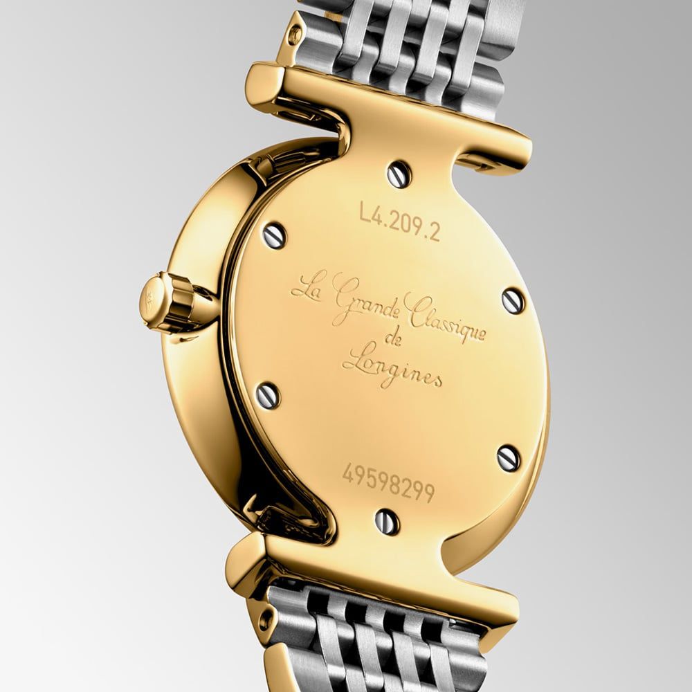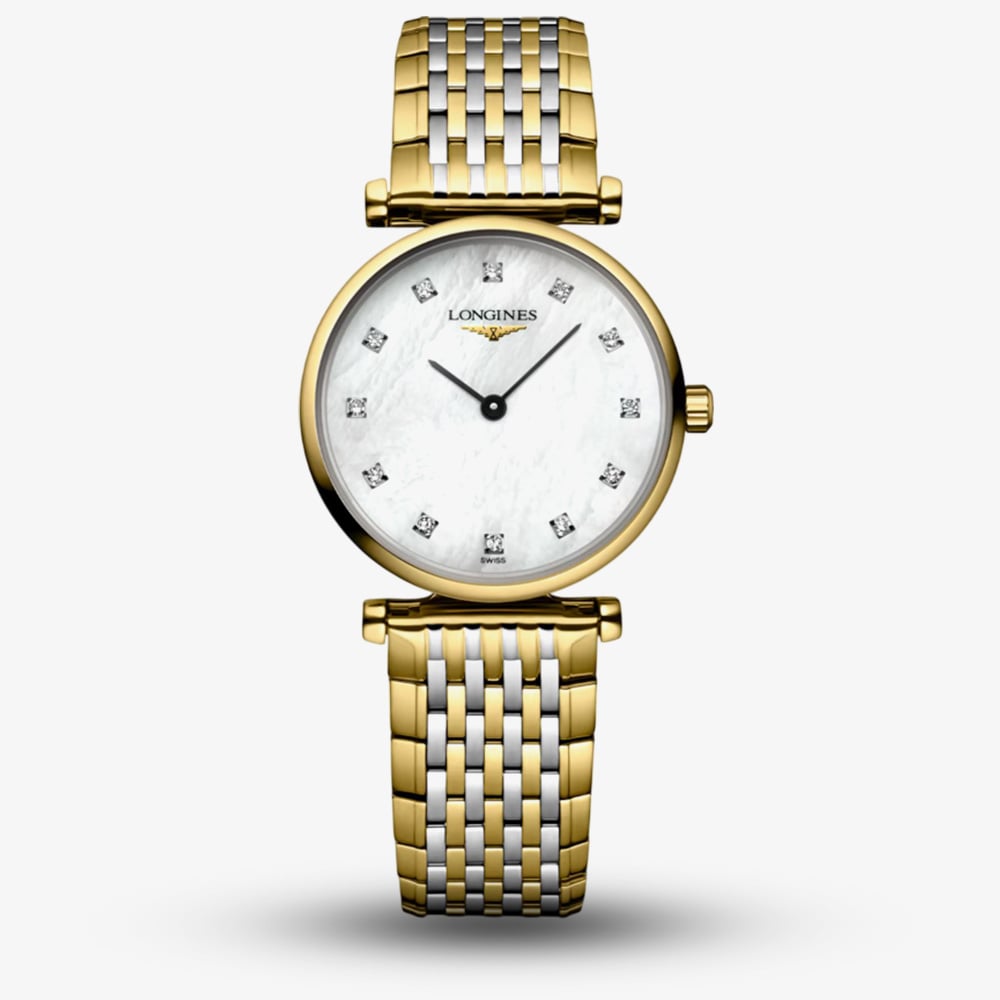 Longines introduces the truly exquisite La Grande Classique collection, possessing a beautiful array of timepieces with the classical styling and flawless quality signature to the brand. Housed below the highly robust sapphire crystal glass dome is the enchanting dial, possessing a mother of pearl dial with a glistening array of diamond hour markers producing a phenomenal effect. Many small links have been combined to create the stunning bracelet, showcasing the intricacy and level of craftsmanship the brand is renowned for. With the bracelet hosting a wonderful two colour design showcasing the gleaming stainless steel used to form the piece with the divine gold plating, you can be sure to stand out among the crowd and catch the eyes of others. The fabulous four silver tone rows create an outstanding contrast against the gorgeous gold, resulting in a unique and opulent timepiece with many glamorous qualities.