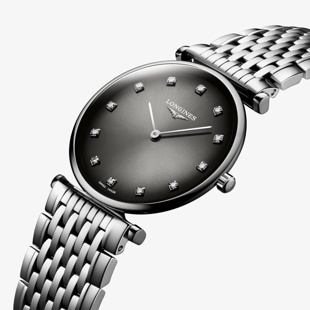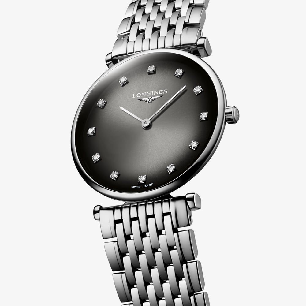 The Longines Ladies La Grande Classique L4.512.4.77.6 features a slim 29mm stainless steel case and matching bracelet with a push-button clasp. Its black dial, set with 12 Top Wesselton VS-SI diamonds (0.081 ct total), is protected by scratch-resistant sapphire crystal. Introduced in 1992, the La Grande Classique line is known for its timeless elegance, refined design, and signature slim profile.