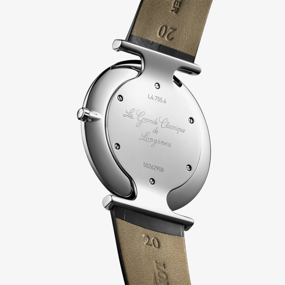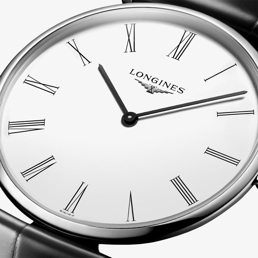 La Grande Classique de Longines, launched in 1992, helped cement the brand’s global reputation with its slim profile, sleek round case, and timeless elegance across various sizes, materials, and colours. This stylish timepiece consists of a black genuine leather strap connected to the stainless steel case. The round white dial offers a 12 hour analogue display using black Roman numeral hour markers and long slim hands for a classic look.