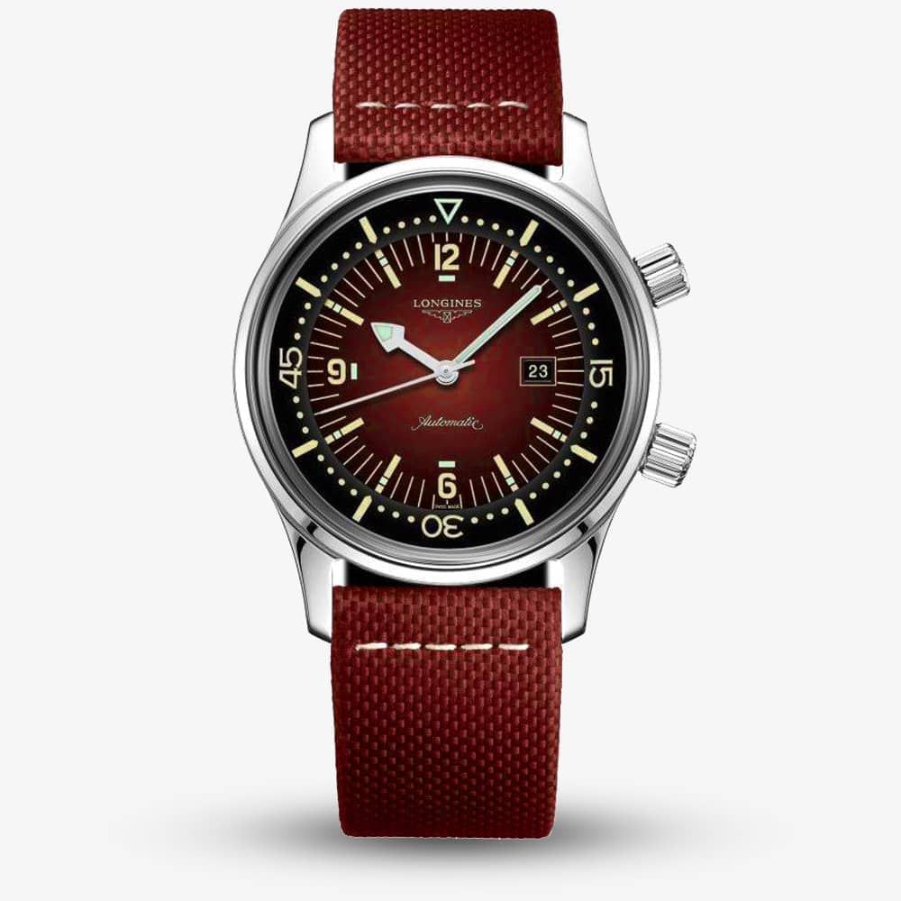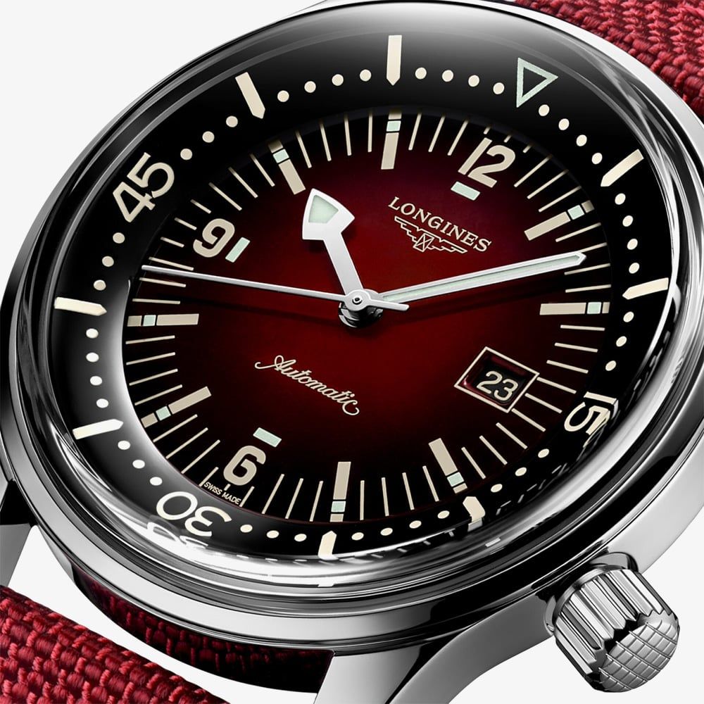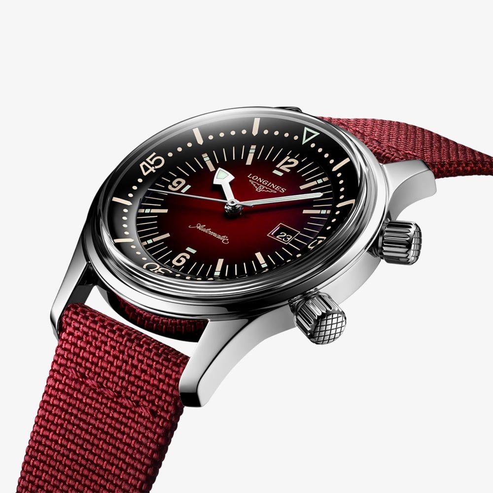 Designed for underwater exploration, the Longines Legend Diver has been a watchmaking icon since 1959. Known for its twin crowns and internal rotating bezel—an in-house innovation for added protection, it combines timeless design with modern performance, powered by exclusive Longines calibres with silicon balance-springs. The Bordeaux dial is protected by sapphire crystal glass, reinforced with several layers of anti-reflective coating on the underside.