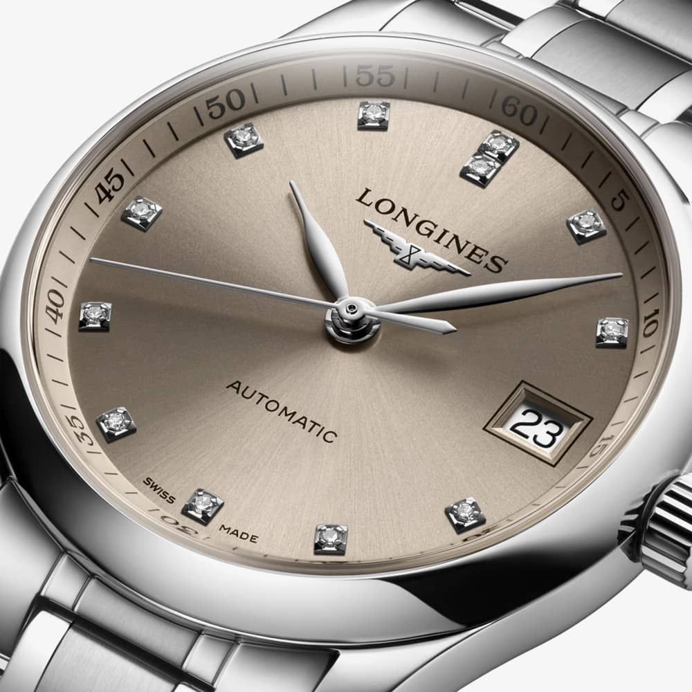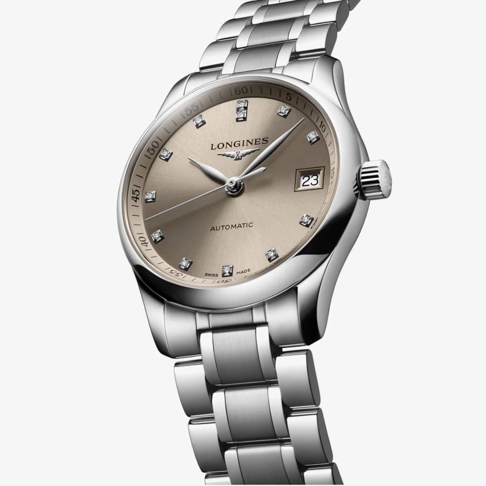 The Longines L2.357.4.07.6 watch combines a 34mm round-shaped stainless steel case and silver stainless steel bracelet with a push button deployment clasp. It has a beige analogue dial with a date display which is protected beneath scratch-resistant sapphire crystal glass. Power is generated by the automatic movement. This model also has a water resistance of up to 30 metres. The watch also features diamond hour markers.