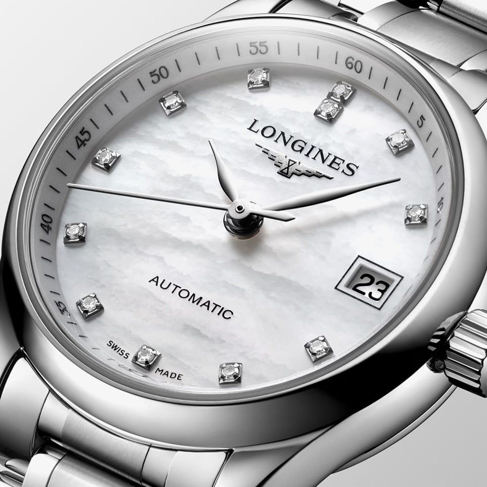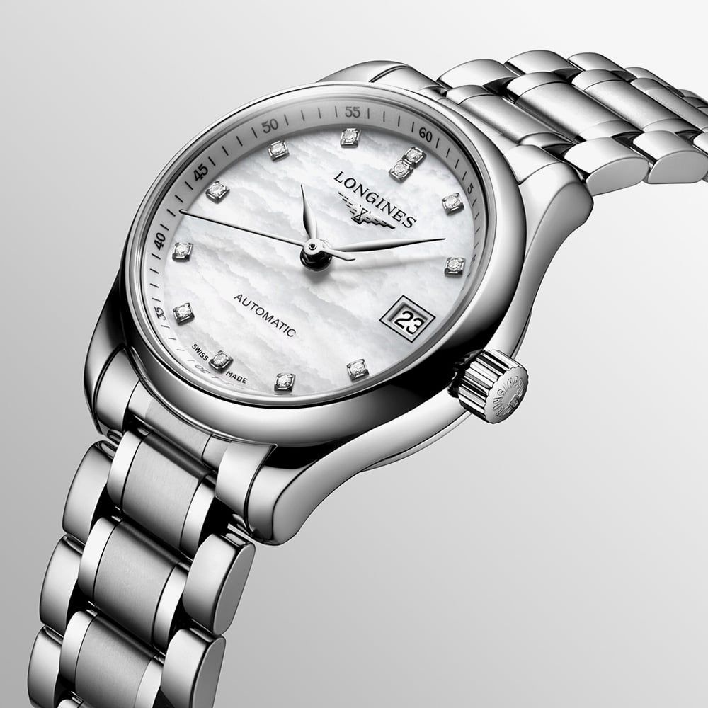 This magnificent watch has been expertly crafted using the finest stainless steel with a contrasting matte and polished link design. An impressive sapphire crystal glass dome ensures an incomparable level of protection for the dial, framed by the accompanying bezel. Set inside the minutes scale is the opulent mother of pearl dial embellished with a glorious array of 12 sparkling diamond stones set at each hour A transparent case back allows the complex mechanism of the watch to be seen.