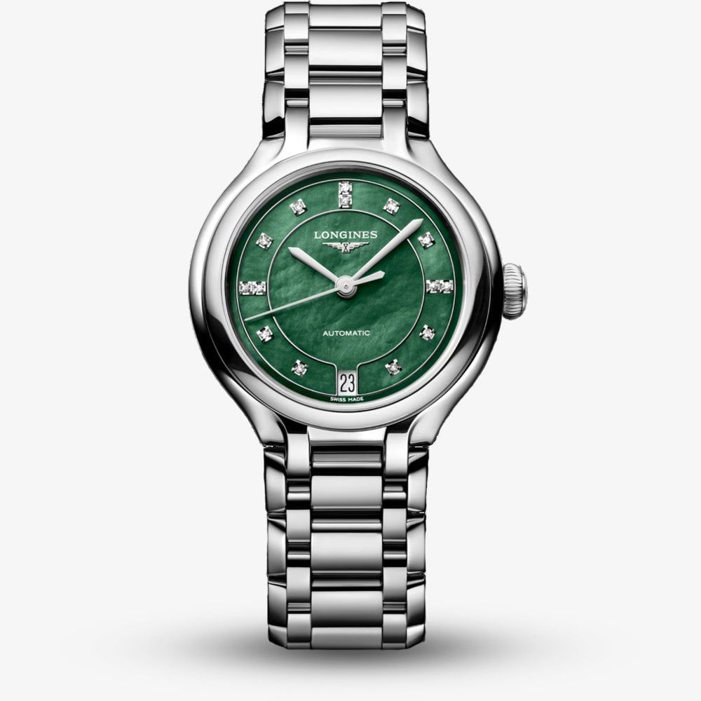 Designed for women who appreciate refined luxury with a contemporary twist. This timepiece features a captivating green mother-of-pearl dial. The silver-tone stainless steel case and bracelet offer a polished, modern profile that enhances the delicate profile of the watch. Diamond-style indexes add subtle sparkle, while sleek silver hands glide effortlessly across the dial. Powered by a precise Swiss quartz movement, this luxurious watch ensures reliable timekeeping wrapped in undeniable elegance.