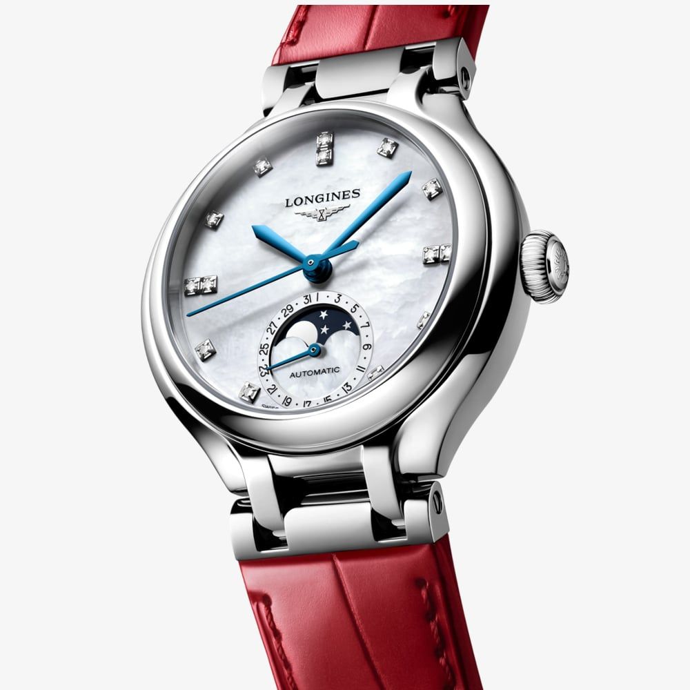 This graceful timepiece features a polished stainless steel case paired with a refined white dial. Roman numeral hour markers enhance its classic charm, while the moonphase display at 6 o’clock adds a unique touch, evoking the beauty of the night sky. The vibrant red leather strap adds a pop of colour and a modern flair, ensuring comfort and a secure fit.