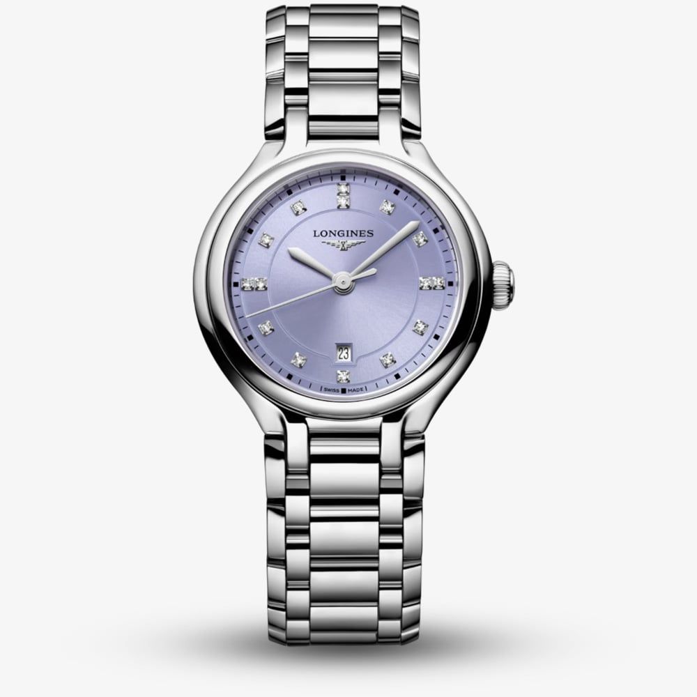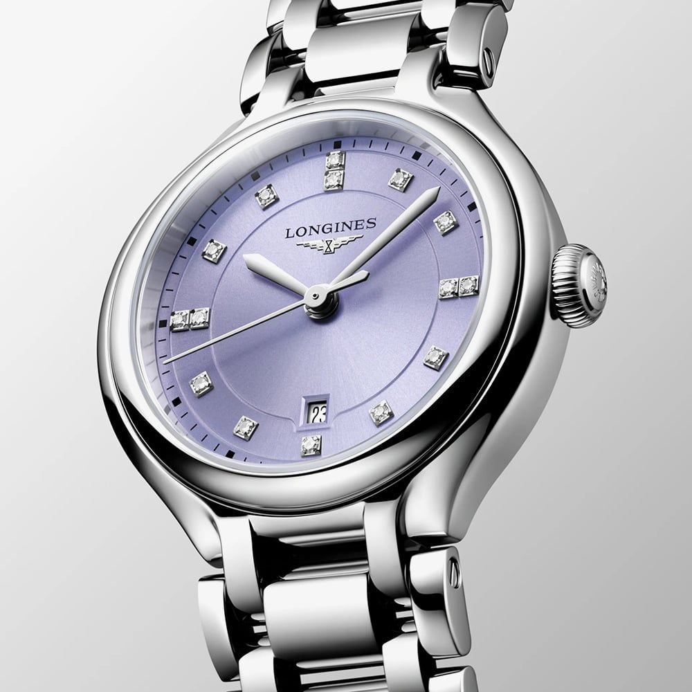 Experience refined luxury with the Longines PrimaLuna Watch, featuring a stainless steel round case and matching bracelet. The deep purple dial is set with 15 Top Wesselton VS-SI diamonds totalling 0.057ct as hour markers, with a practical date window at 6 o’clock. A striking blend of colour and craftsmanship, this elegant timepiece is perfect for everyday sophistication or special occasions.
