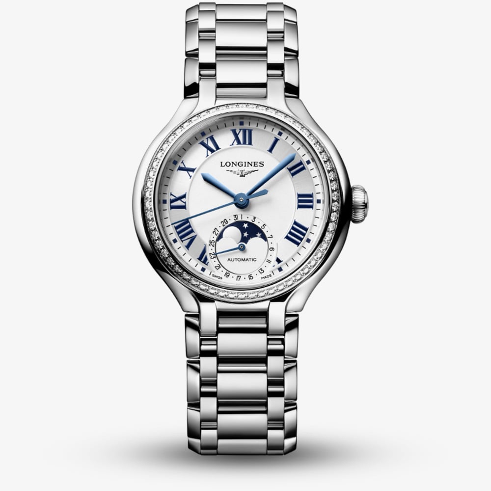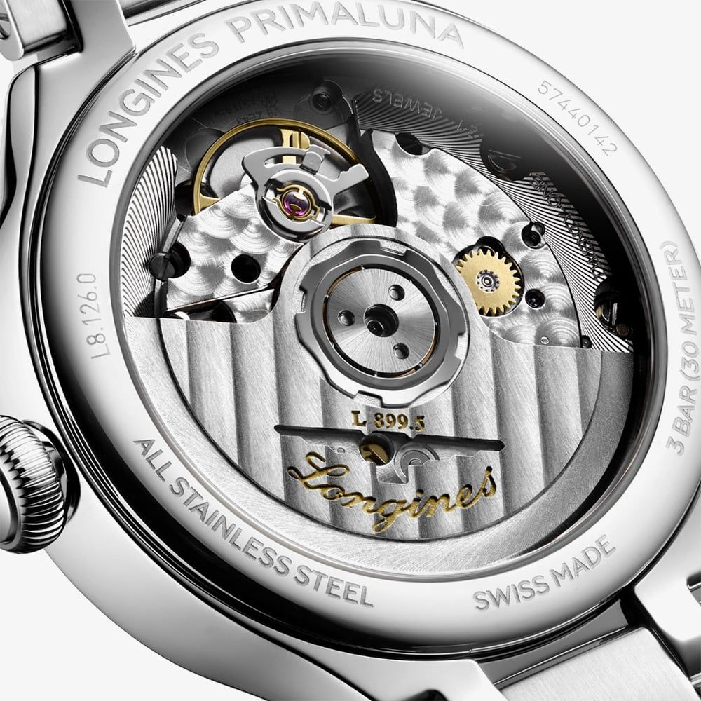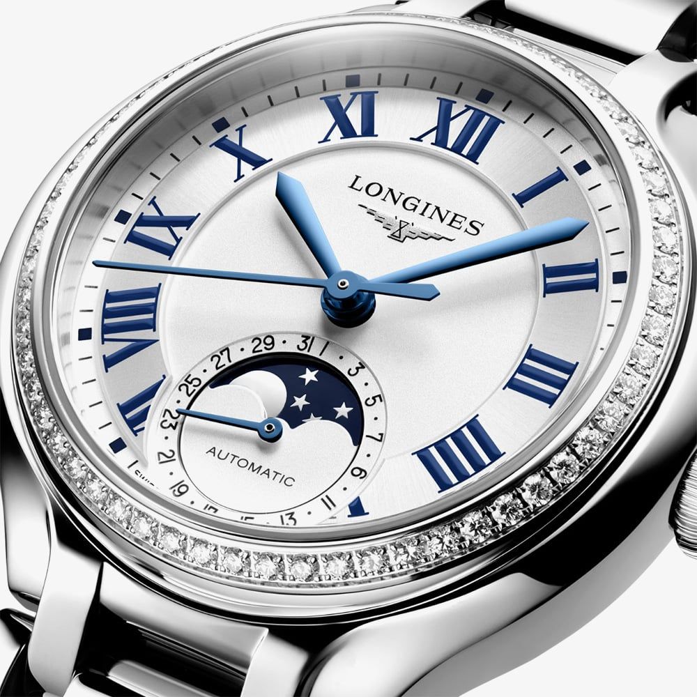 The Longines Primaluna Moonphase exudes timeless sophistication with its refined silver sunray dial, adorned with classic Roman numeral hour markers and elegant blued steel hands. A poetic moonphase display adds a celestial touch, while the bezel is encircled with 58 Top Wesselton diamonds (0.58ct total), radiating brilliance and grace. Paired with a sleek silver stainless steel bracelet, this timepiece seamlessly blends modern refinement with enduring elegance. A transparent case back reveals the intricate mechanical movement within, a true reflection of Longines’ storied craftsmanship and heritage.