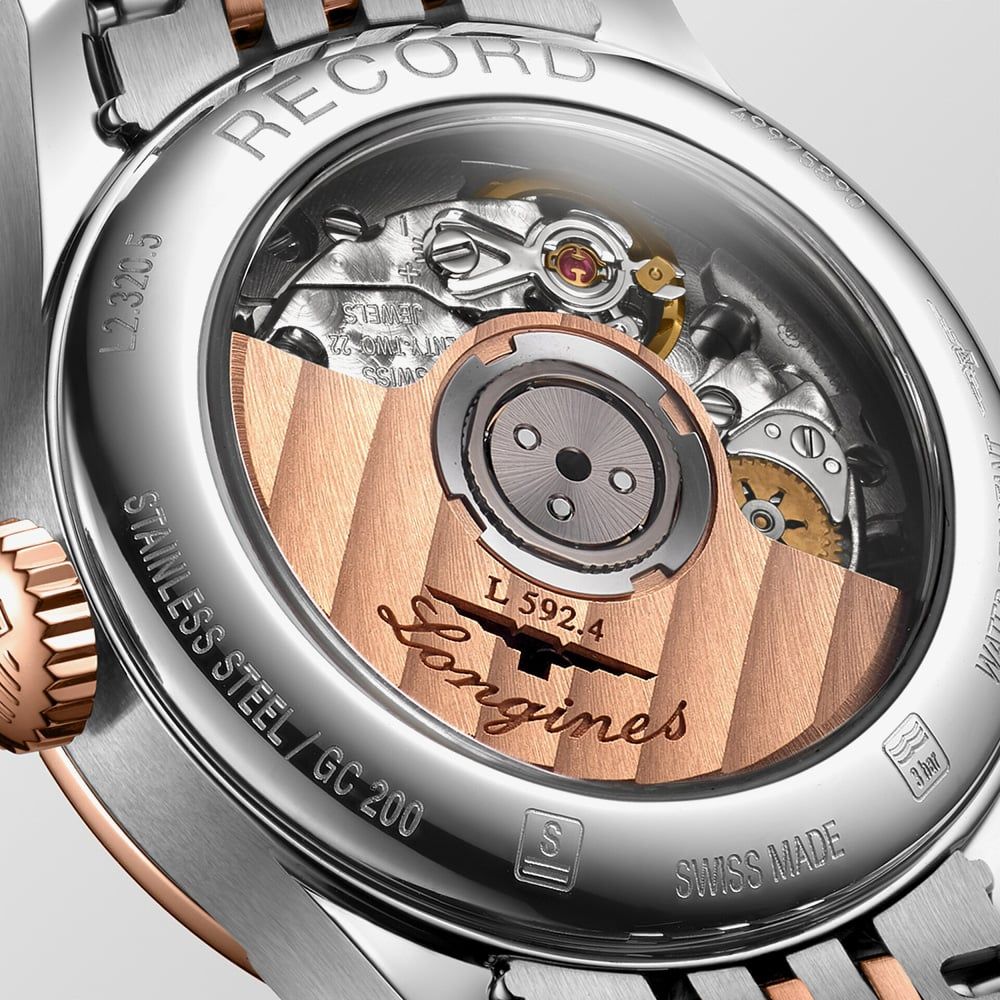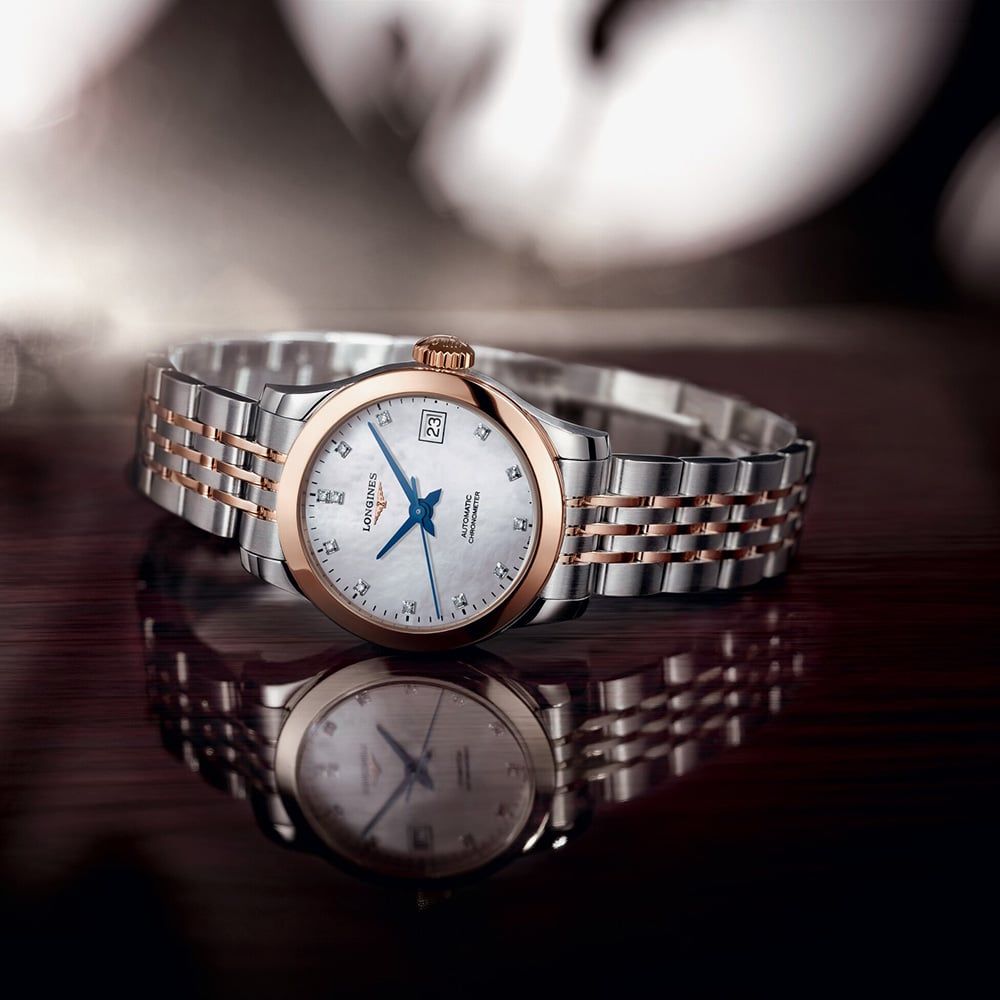 https://www.thbaker.co.uk/longines-ladies-record-diamond-set-mother-of-pearl-dial-two-colour-bracelet-watch-l2-320-3-87-772143Longines Ladies Record Diamond Set Mother Of Pearl Dial Two Colour Bracelet Watch L2.320.5.87.7https://www.thbaker.co.uk/media/catalog/product/2/4/24-76-108_grey.jpg19953300GBPOutOfStockRECORD SS/RSE BW MOP DIA A stunning ladies timepiece from Longines and the Record range, encompassing expert Swiss craftsmanship and glamorous style. Forged from polished stainless steel with 18ct rose gold capped detailing, scratch resistant sapphire crystal glass and a COSC certified automatic chronometer movement. The round mother of pearl dial features elegant blue hands, date window and dazzling diamond hour markers with the prestigious winged Longines logo under the 12 o clock position. Complete with a stylish two colour bracelet and secure push button deployment clasp fastening.