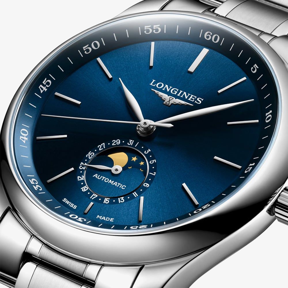 The Longines Master Collection Moonphase showcases the brand’s dedication to timeless style and watchmaking excellence, featuring refined models with moonphase complications and intricate mechanical movements that reflect Longines’ rich heritage. Scratch resistant sapphire crystal protects the dial, which consists of sunray blue with silver hands and indexes. Functions also include a date display and moon phase indicator, and power is generated by the L899 automatic movement with a 72 hour power reserve, which can be seen through the transparent sapphire crystal case back.