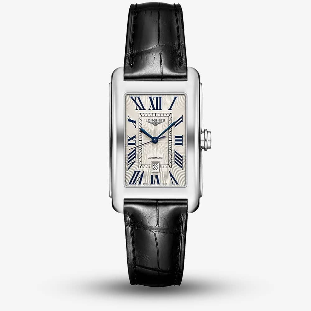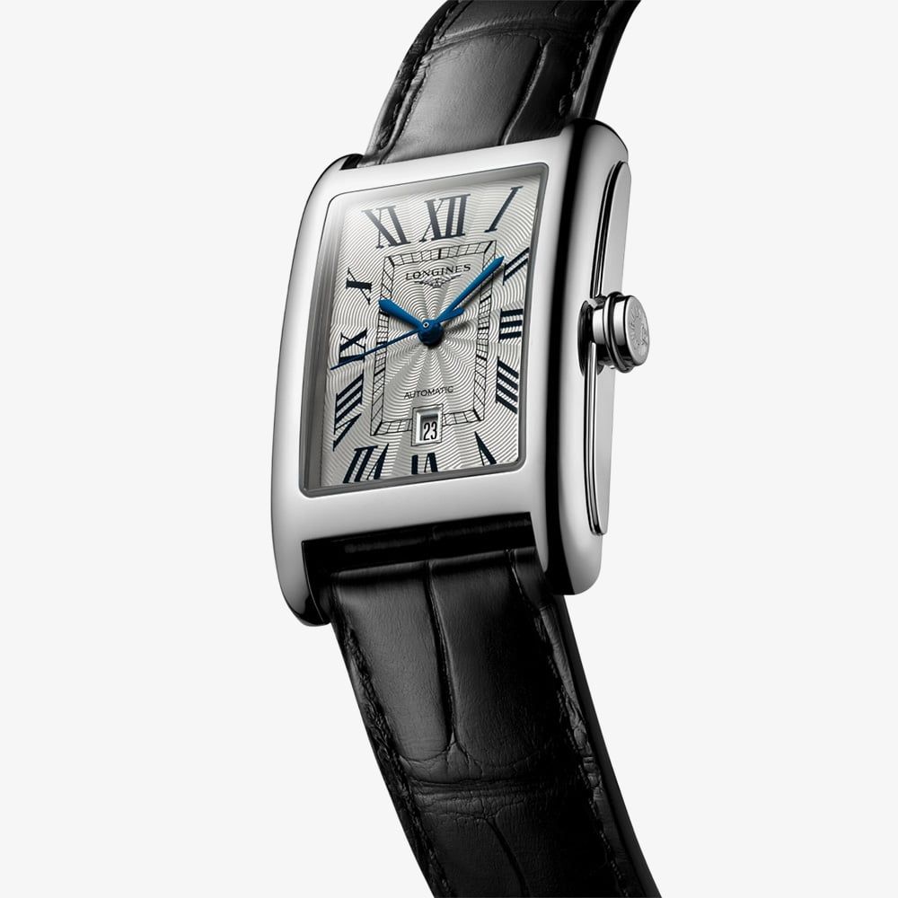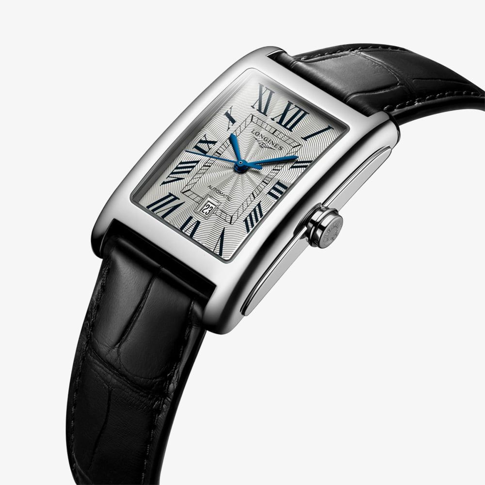 The Longines DolceVita collection blends timeless elegance with modern flair, inspired by a 1920s model and defined by its signature rectangular case and balanced design. The polished stainless steel rectangular case is fitted with scratch resistant sapphire crystal glass and a black alligator leather strap. The rectangular guilloche pattern dial features full roman numeral figures and a date window at 6 o clock.