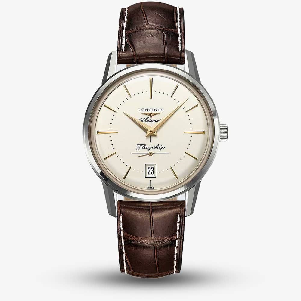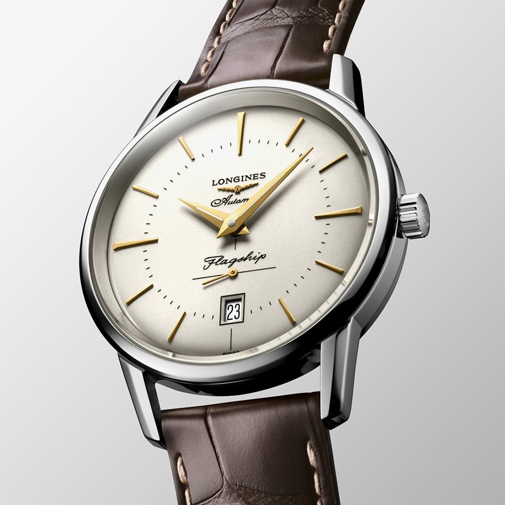 Timeless design meets Swiss precision in the Longines Flagship Heritage. Featuring a silver dial with Super-LumiNova hands, and a self-winding movement with a 50-hour power reserve, this watch blends classic style with modern performance. Scratch-resistant sapphire crystal protects the dial, while an 18ct gold caravelle medallion on the case back adds a touch of heritage. Paired with a refined alligator leather strap, it’s the perfect piece for those who value elegance and tradition.
