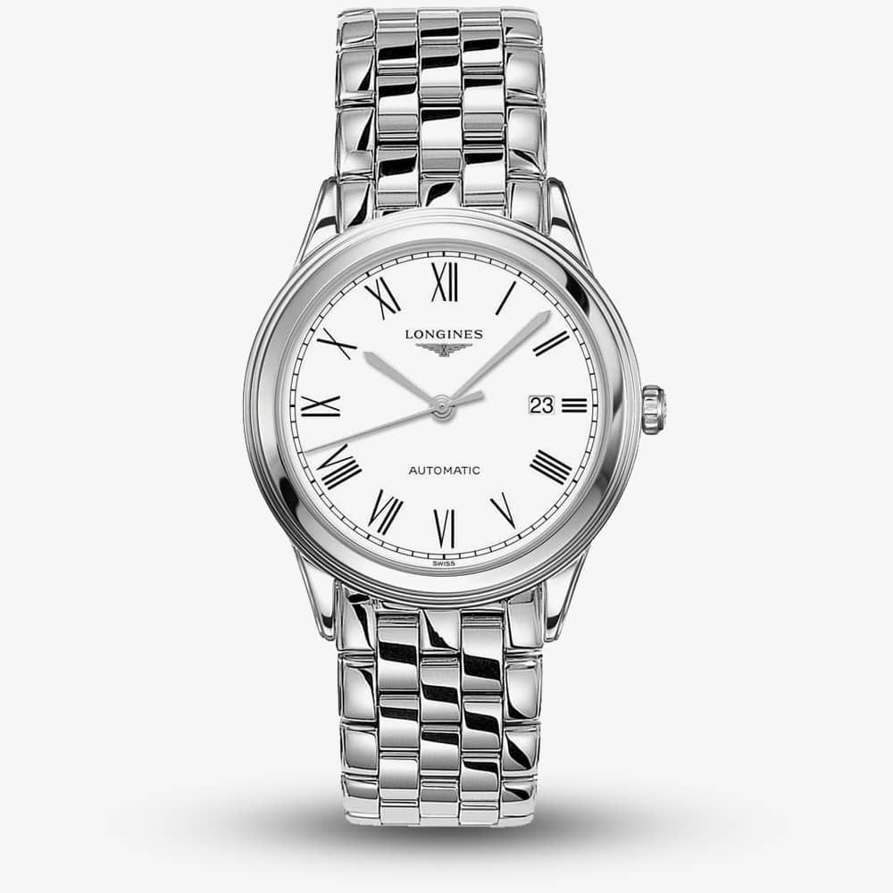 A Longines Flagship series watch crafted from stainless steel featuring a link bracelet with triple folding safety clasp and push button. Scratch resistant sapphire crystal with several layers of anti-reflective coating on the underside protects the dial, which consists of a white backdrop with black roman numerals, silver tone dial hands and a date display. The watch is powered by a Caliber L619/888 automatic movement, a self winding mechanical movement with a 64 hour power reserve which can be seen through the transparent sapphire crystal case back.