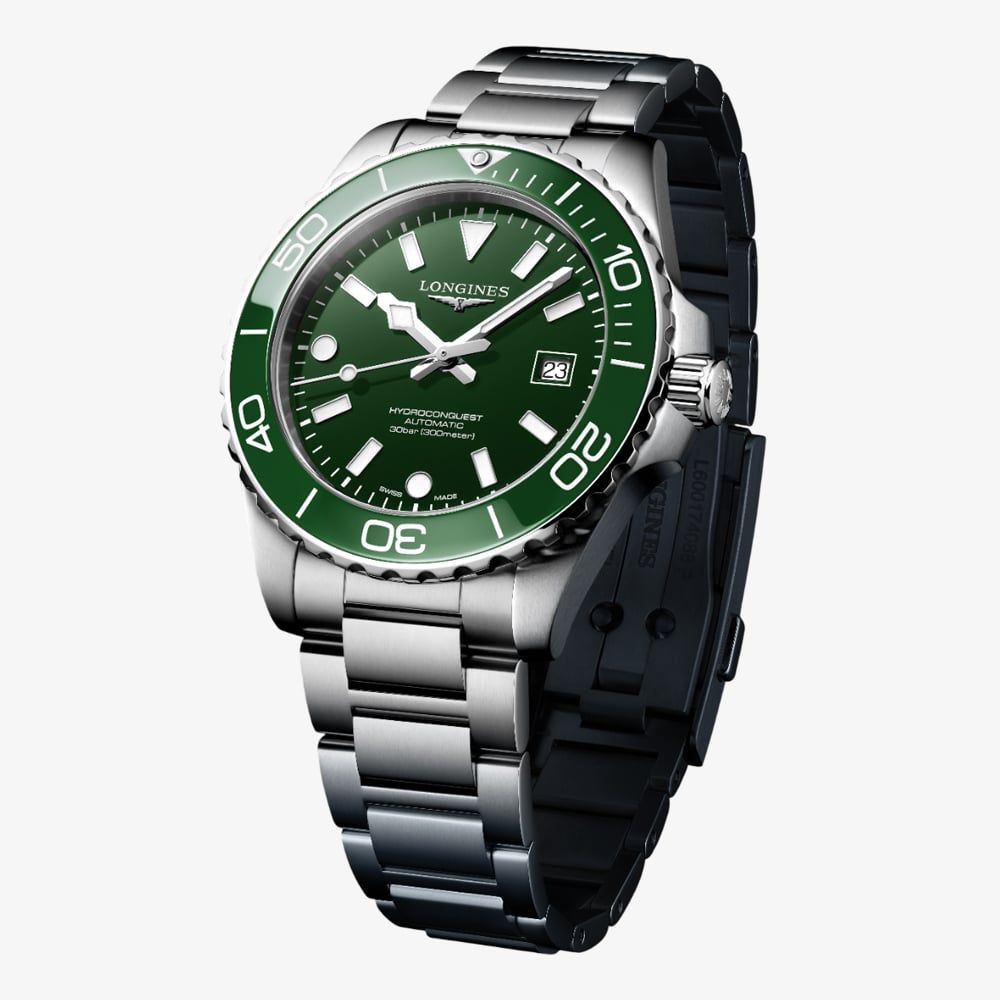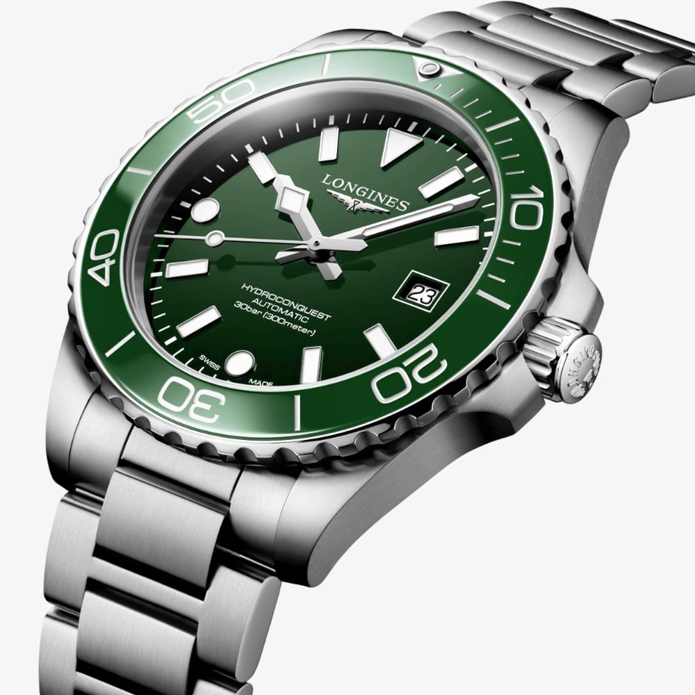 • 300 metre water resistance.Longineshttps://www.thbaker.co.uk/media/catalog/product/2/4/24-99-l3.788.4.06.6_longines_02.jpghttps://www.thbaker.co.uk/media/catalog/product/2/4/24-99-l3.788.4.06.6_longines_03.jpghttps://www.thbaker.co.uk/media/catalog/product/2/4/24-99-l3.788.4.06.6_longines_04.jpghttps://www.thbaker.co.uk/media/catalog/product/2/4/24-99-l3.788.4.06.6_longines_05.jpgcondition:Nodisc_no_stock:Noex_display:NoNoNoNo2499L3.788.4.06.6LonginesL3.788.4.06.6MensOfficial Longines Packaging5 Year Longines WarrantyLuxuryNoWatchSilverStainless Steel BraceletStainless SteelRound42.0mmAnalogueSapphire Crystal GlassGreenGreen300 metresAutomaticFold Over ClaspNo StoneNo Stone180.0gNoNoNoNoYesYesNo{"name":"v12_finance","text":"Or from \u00a337 per month","imageUrl":"https:\/\/www.thbaker.co.uk\/media\/nosto\/v12-finance.png"}Longines Mens Hydroconquest Automatic 42mm Green Dial Watch24-99-L3.788.4.06.62026-03-26 00:00:000["\/Watches~|~\/watches\/~|~4","\/Watches\/Mens Watches~|~\/mens-watches\/~|~2","\/Watches\/Divers Watches~|~\/divers-watches\/~|~23","\/Watches\/Automatic Watches~|~\/automatic-watches\/~|~17","\/Watches\/Swiss Watches~|~\/swiss-watches\/~|~6","\/Brands A-Z\/Longines Watches~|~\/longines-watches\/~|~90","\/Brands A-Z\/Longines Watches\/Longines Mens~|~\/longines-mens-watches\/~|~1","\/Brands A-Z\/Longines Watches\/Longines Diving Collection\/Longines Hydroconquest~|~\/longines-hydroconquest-watches\/~|~1","\/Watches\/Luxury Watches~|~\/luxury-watches\/~|~14","\/Brands A-Z\/Longines Watches\/Longines Diving Collection~|~\/longines-diving-watches\/~|~7","\/Brands A-Z\/Longines Watches\/Longines Performance Collection~|~\/longines-performance-watches\/~|~8","\/Free Gift Card - When you spend \u00a3500+~|~\/free-gift-card\/~|~43","\/Watches\/Luxury Watches\/Mens Luxury Watches~|~\/mens-luxury-watches\/~|~2","\/Watches\/Colourful Watches~|~\/colourful-watches\/~|~20","\/\u00a3150 Gold Gift Card (\u00a31000 - \u00a32000)~|~\/150-gold-gift-card\/~|~49","\/Free Gift With Purchase Products~|~\/free-gift-with-purchase-products\/~|~37","\/Watches\/Colourful Watches\/Green Watches~|~\/green-watches\/~|~1","\/Watches\/Waterproof Watches~|~\/waterproof-watches\/~|~28"]2026-03-26