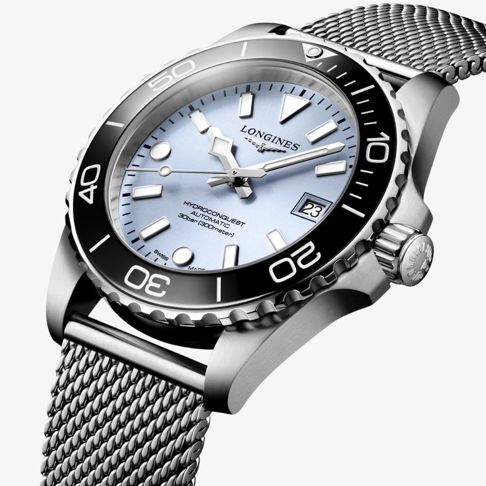 https://www.thbaker.co.uk/longines-mens-hydroconquest-automatic-ice-blue-dial-mesh-bracelet-watch-l3-779-4-99-6179737Longines Mens Hydroconquest Automatic Ice Blue Dial Mesh Bracelet Watch L3.779.4.99.6https://www.thbaker.co.uk/media/catalog/product/2/4/24-99-l3.779.4.99.6_longines_01.jpg20502050GBPInStock/Brands A-Z/Longines Watches/Brands A-Z/Longines Watches/Longines Mens/Brands A-Z/Longines Watches/Longines Diving Collection/Brands A-Z/Longines Watches/Longines Diving Collection/Longines Hydroconquest/Watches/Mesh Bracelet Watches/Watches/Luxury Watches/Watches/Luxury Watches/Mens Luxury Watches/Free Gift Card - When you spend £500+/£200 Gold Gift Card (£2001 - £3000)/Admin/Free Gift With Purchase Products/Watches/Swiss Watches/Brands A-Z/Longines Watches/Longines Performance Collection/Watches/Automatic Watches/Watches/Mesh Bracelet Watches/Mens Mesh Bracelet Watches/Watches/Waterproof Watches/Watches/Divers Watches/Watches/Watches/Mens Watches/Flash Sale5735573767745744783664437358723473967633469267754675783778394303362636278042124792573567743626644364137836Longines Hydroconquest Ice Blue Dial Mesh Featuring a striking ice blue dial, this watch offers exceptional legibility with luminescent hands and markers, perfectly complemented by a durable stainless steel mesh bracelet. The unidirectional rotating bezel, screw-down crown, and impressive 300m water resistance make it ideal for diving. A versatile accessory, this timepiece seamlessly transitions from professional settings to casual outings.