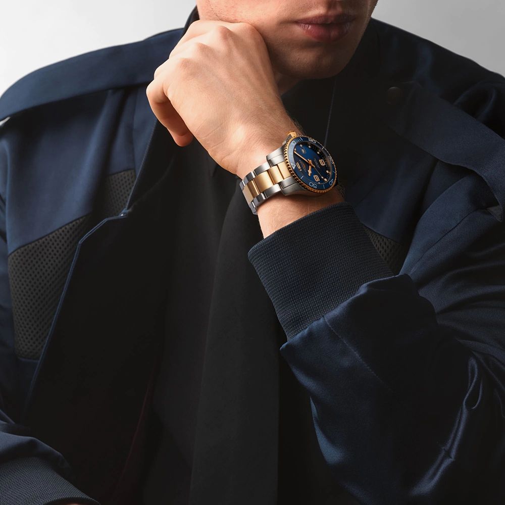 The Longines L3.781.3.96.7 HydroConquest watch combines a 41mm round shaped stainless steel case and two tone PVD gold plated bracelet with a fold over clasp. It has a blue analogue dial with SuperLumiNova hands and a date display which is protected beneath scratch resistant sapphire crystal glass. Power is generated by the automatic movement with 21 jewels. This model also has a water resistance of up to 300 metres.