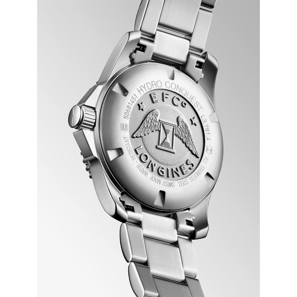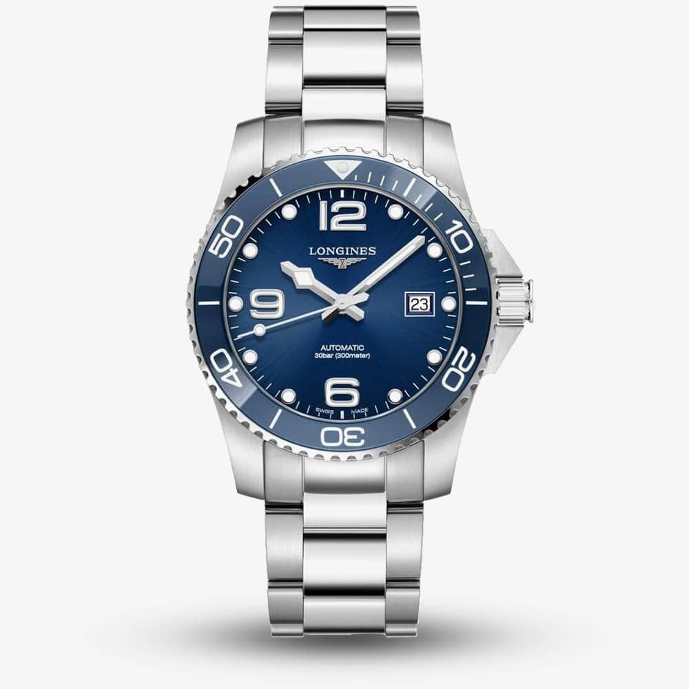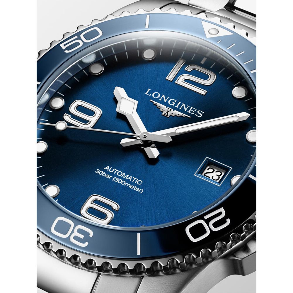 The Longines Mens HydroConquest Watch L3.781.4.96.6 combines a 41mm round shaped stainless steel case, a ceramic bezel and a stainless steel bracelet with a double safety folding clasp and integrated diving extension. It has a sunray blue dial with luminescent hands and a date window at three o-clock, which is protected beneath sapphire crystal glass. Power is generated by the automatic movement, with a power reserve of approximately 72 hours. This model also has a water resistance of up to 300 metres.