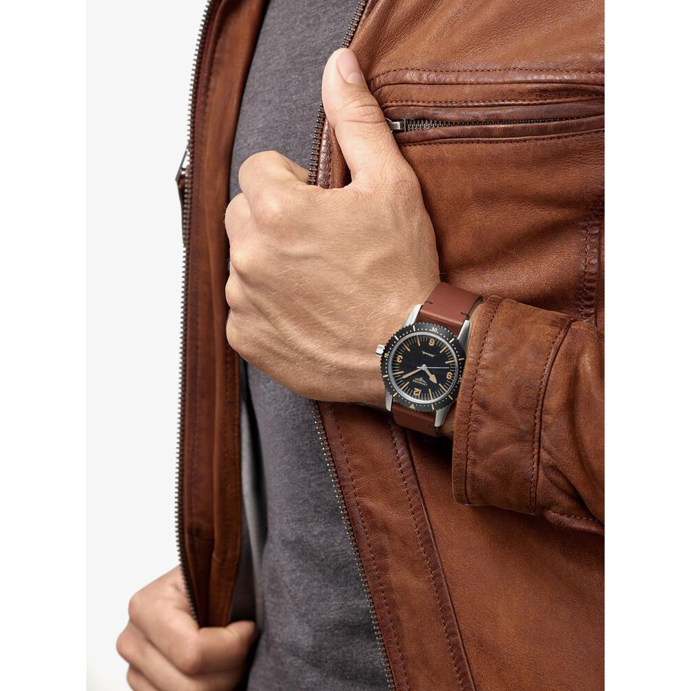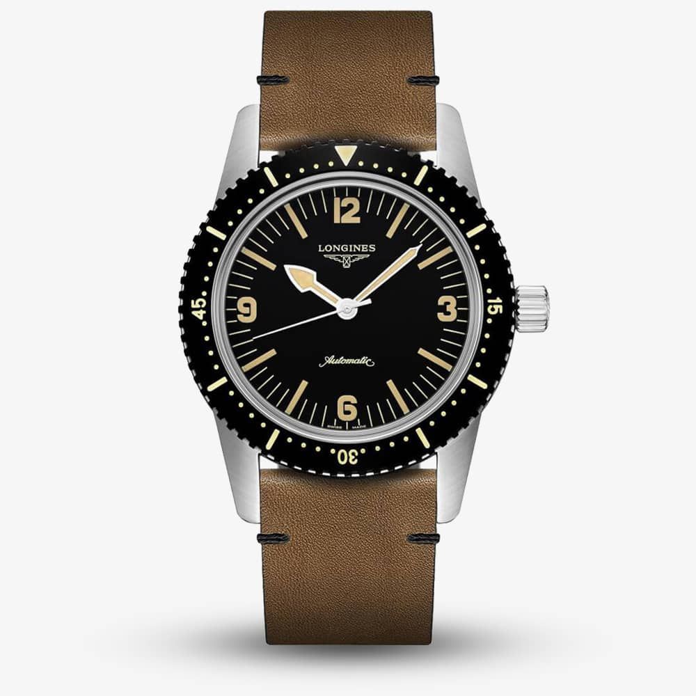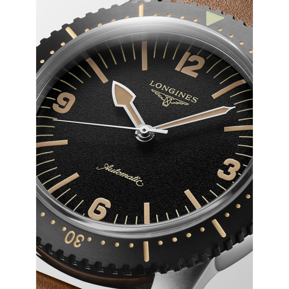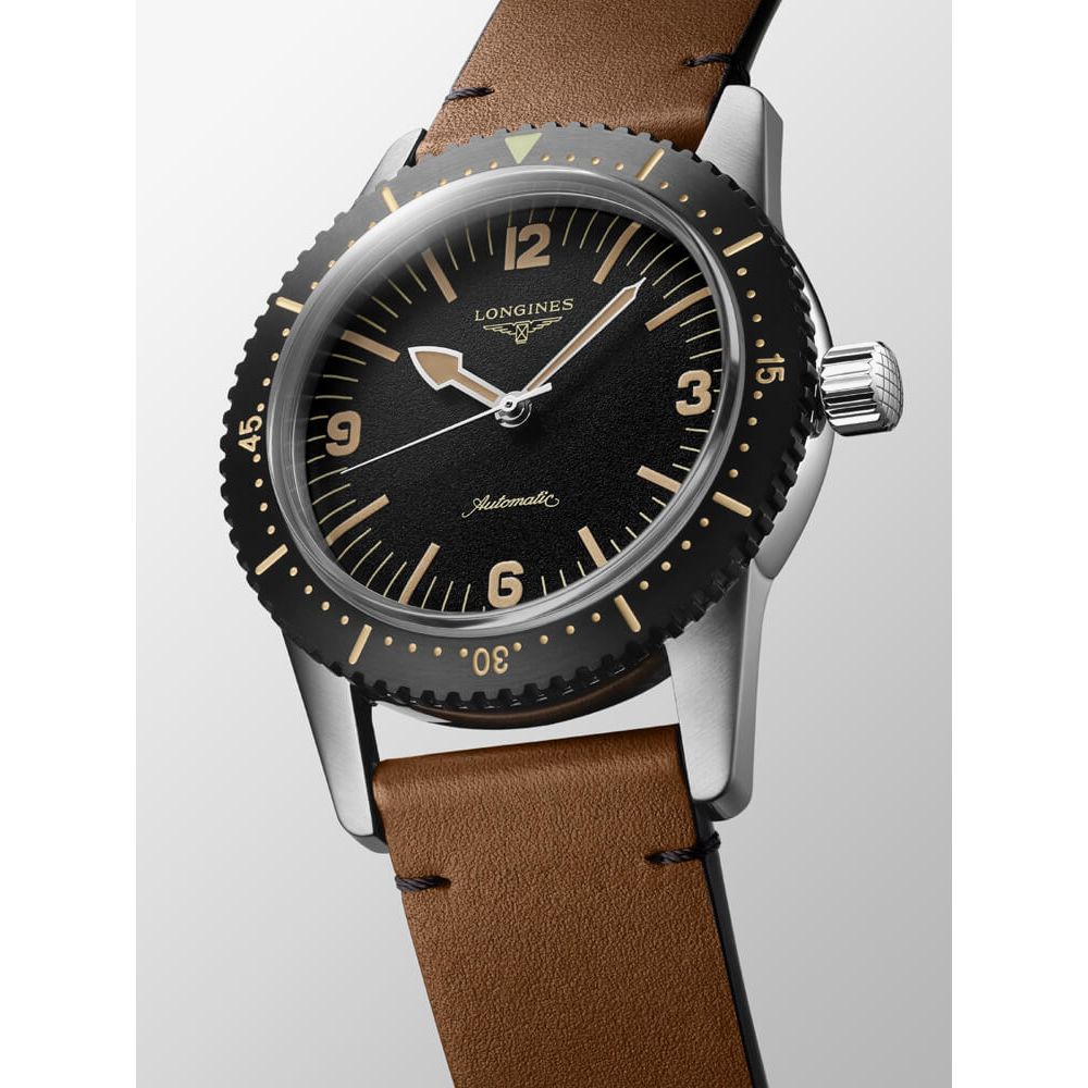 The Longines Mens Skin Diver Watch L2.822.4.56.2 combines a 42mm round shaped stainless steel case and a brown leather strap with a traditional buckle fastening. It has a black analogue dial which is protected beneath sapphire crystal glass. Power is generated by the automatic movement, with a power reserve of approximately 72 hours. This model also has a water resistance of up to 300 metres.