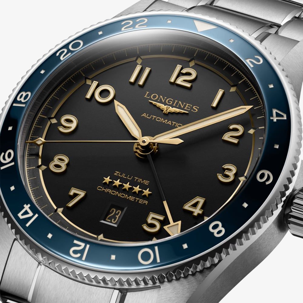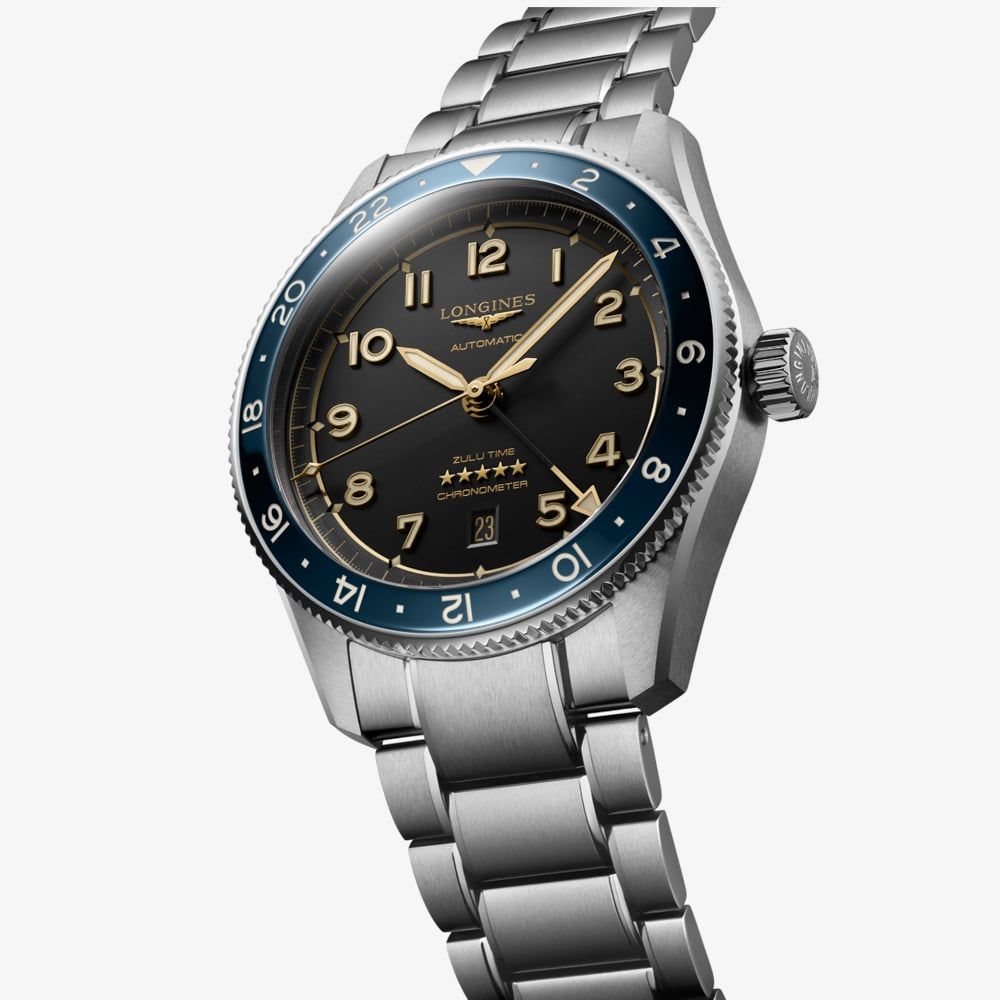 Crafted with meticulous attention to detail, this watch features a striking blue bezel that complements its stainless steel case, offering both durability and a sophisticated aesthetic. The bold design is matched by its functionality, as the Zulu Time complication allows for simultaneous tracking of two time zones, ideal for frequent travelling. The dial is designed for clarity and readability, with luminous hands and markers ensuring visibility in any lighting condition. Powered by a precise automatic movement, this watch not only keeps impeccable time but also exudes a sense of reliability and style.