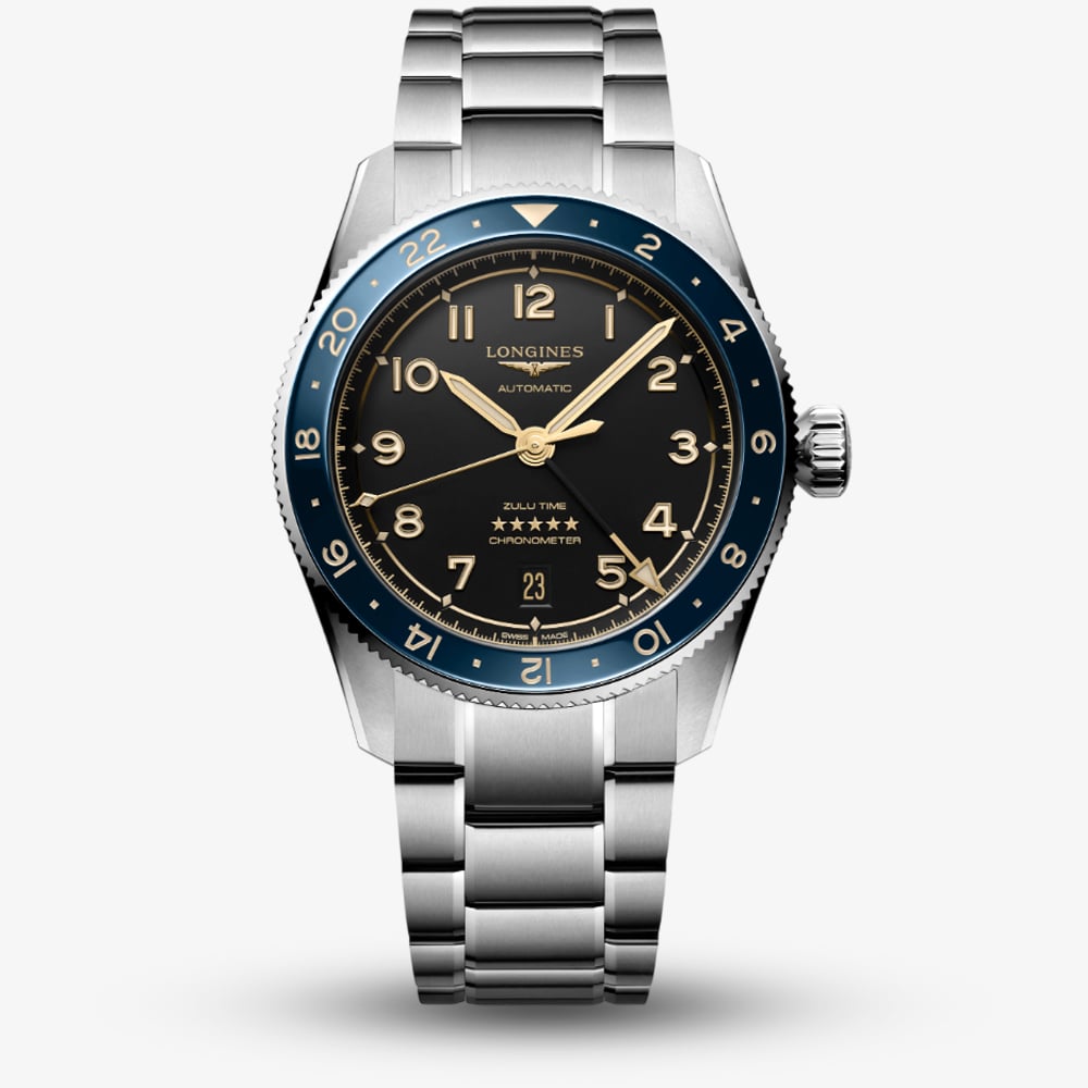 A testament to precision and elegance in timekeeping. This watch seamlessly blends functionality with sophistication. Powered by the reliable automatic movement, ensuring accurate timekeeping in any setting, the stainless steel case houses a striking blue bezel that not only enhances its aesthetic appeal but also serves a practical purpose with its Zulu time function. The bold black dial features a clean design with luminous hands and markers, offering effortless readability in low-light conditions. A date window at 6 o'clock adds convenience, while the sapphire crystal glass protects against scratches, maintaining clarity and durability. The robust stainless steel bracelet provides both comfort and resilience during daily wear. With water resistance up to 100 metres, this timepiece is ready for any adventure.